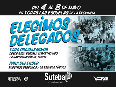 1.- Que viene a informar de la realización del Acto de la ELECCIÓN DE DELEGADOS DE ESCUELAS de la Provincia de Buenos Aires, dispuesto por el S.U.T.E.B.A, entre los días 04/05/15 y 08/05/15, en todas las Escuelas de la Provincia , conforme las prescripciones de la Ley 23551 y su Decreto Reglamentario Nº 467/88 y los Estatutos Sociales, realizándose el mismo en mas de una jornada, atento a la modalidad de asistencia del personal y en virtud de los distintos niveles y modalidades que componen la Educación en la provincia de Buenos Aires.