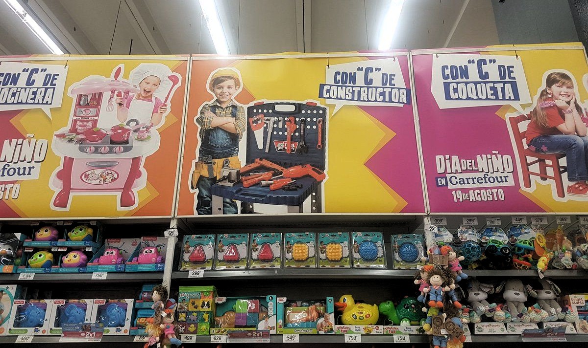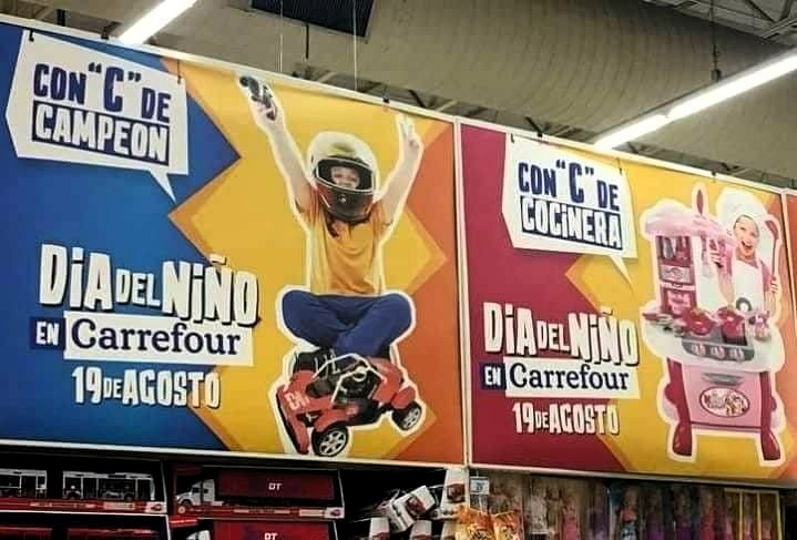 La campaña para la venta de juguetes que instala Carrefour en Argentina dista mucho de los tiempos que vivimos en nuestro país en relación al debate social acerca de la igualdad y la ruptura de estereotipos. Muchas familias recorren esas góndolas acompañadas de sus hijos e hijas, personas en crecimiento, que ven que hay juguetes para niños y niñas que comienzan con C de Carrefour: Cocinera, Constructor, Coqueta, Corredor de Auto, Campeón; pero no con C de Cooperación, Compañerismo; Compartir.