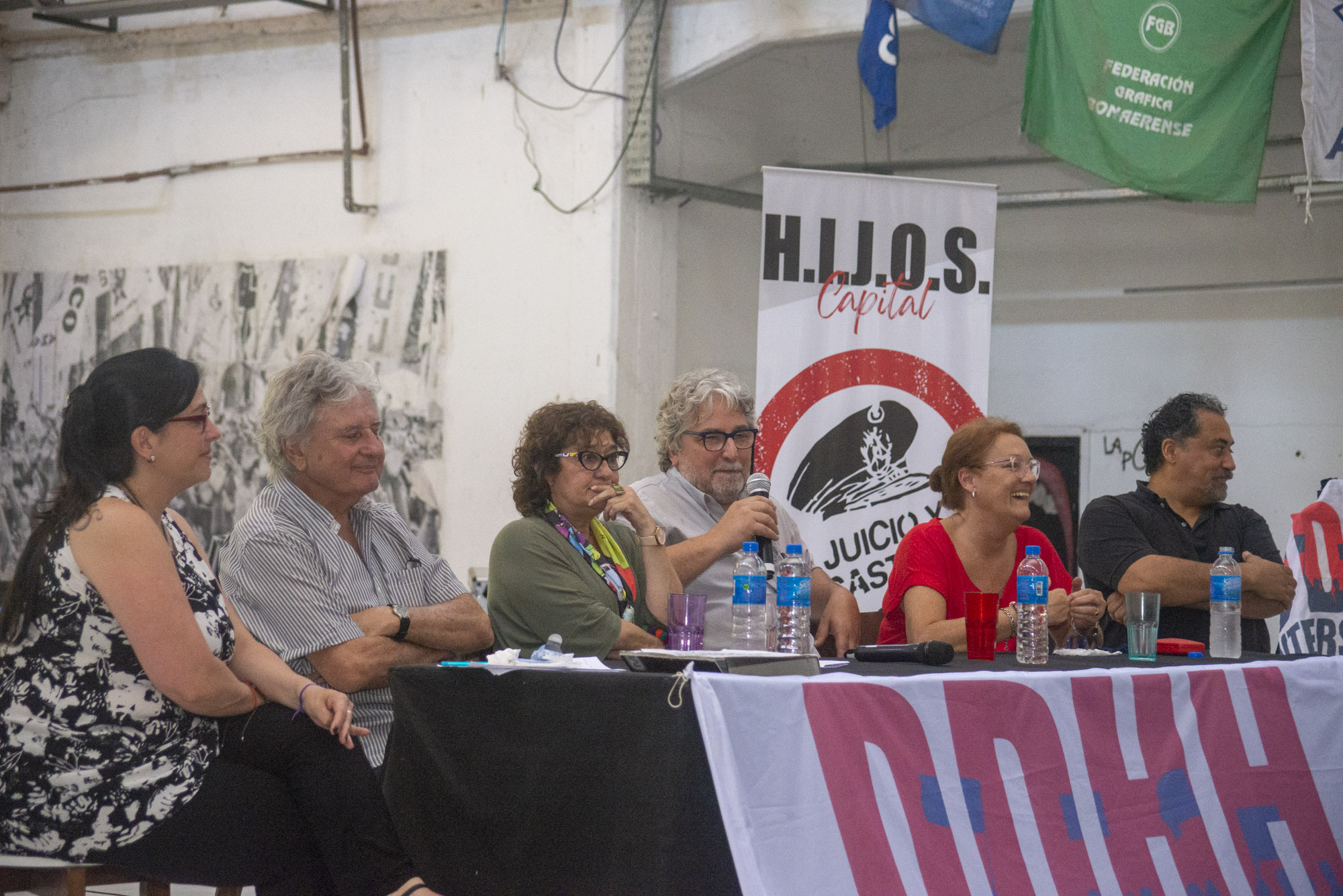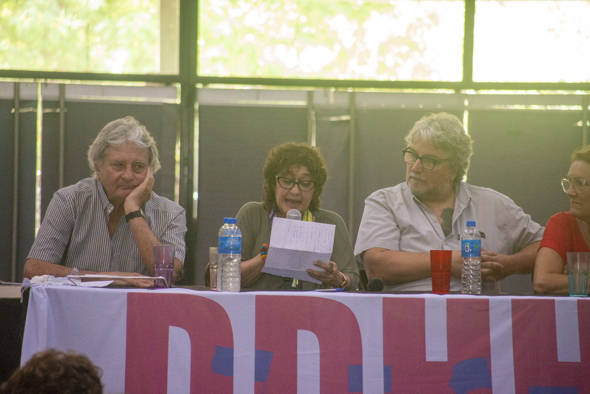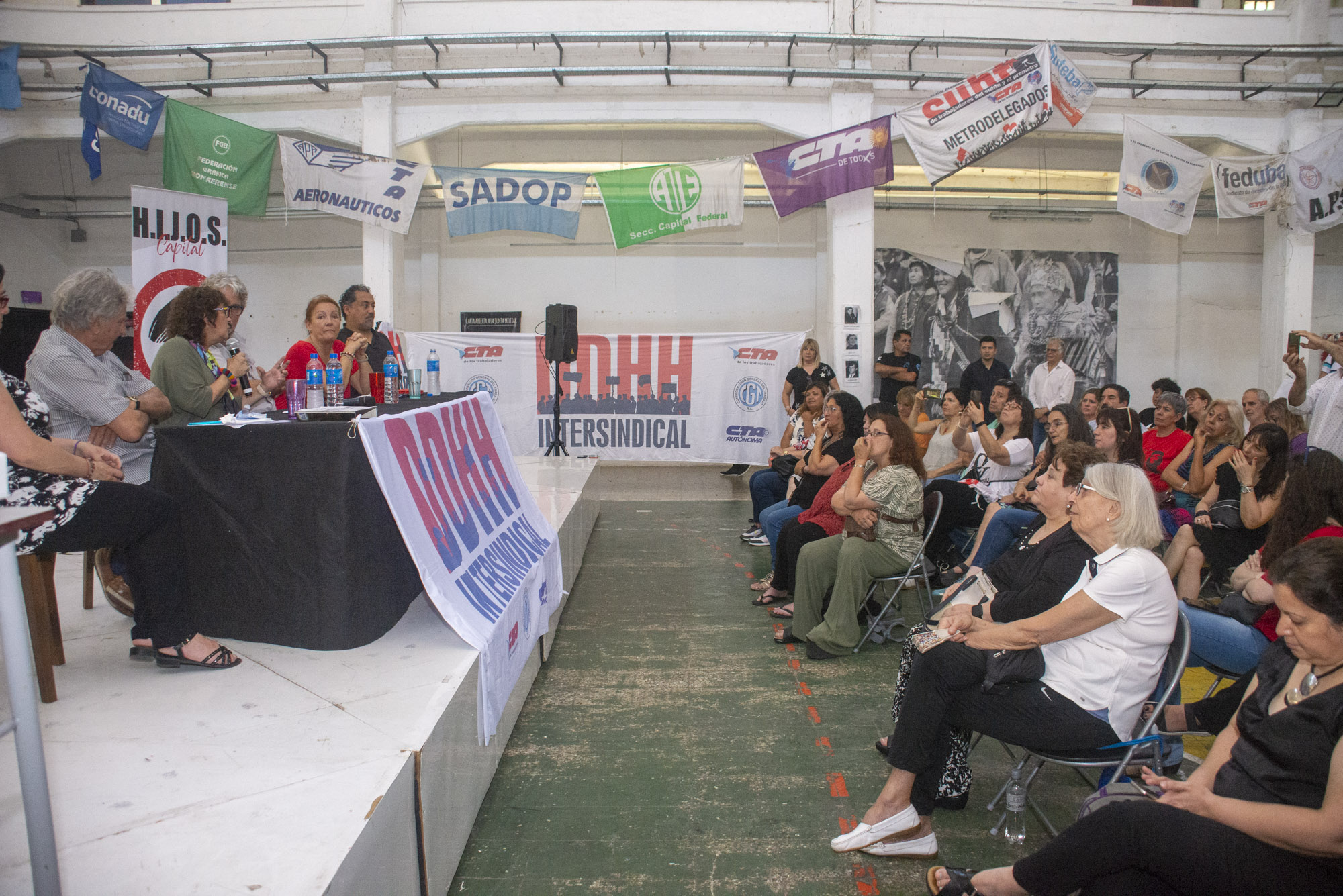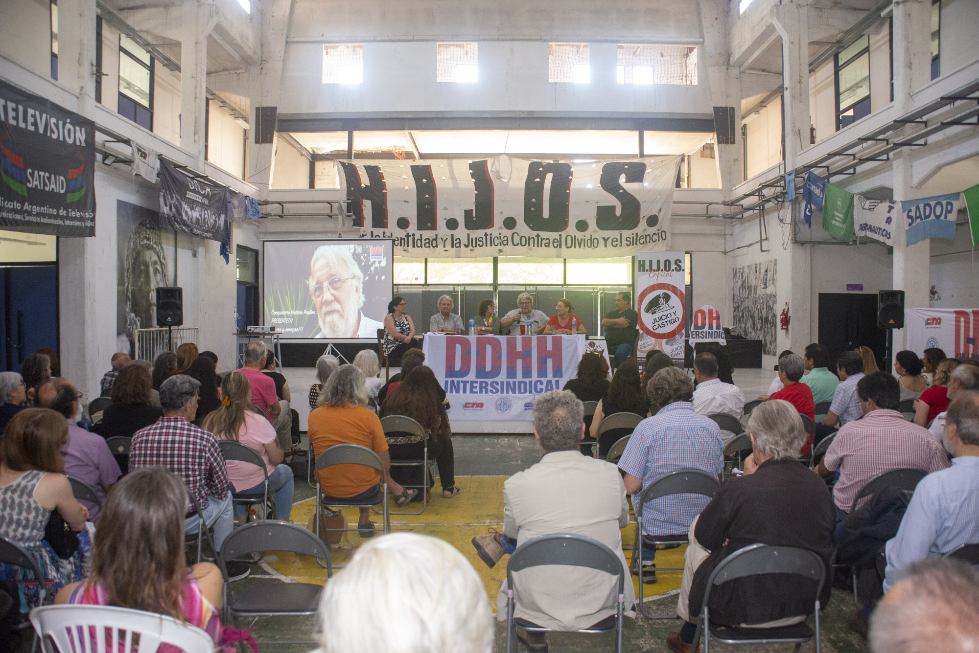 El panel de oradorxs estuvo conformado por Carlos Monestes, dirigente de CTA Capital; Patricia Mounier, Secretaria de DDHH de SADOP Nacional, ambxs de la Intersindical; Sonia Alesso, Secretaria General de CTERA; y Mariano Paulón, hijo de Victorio.
