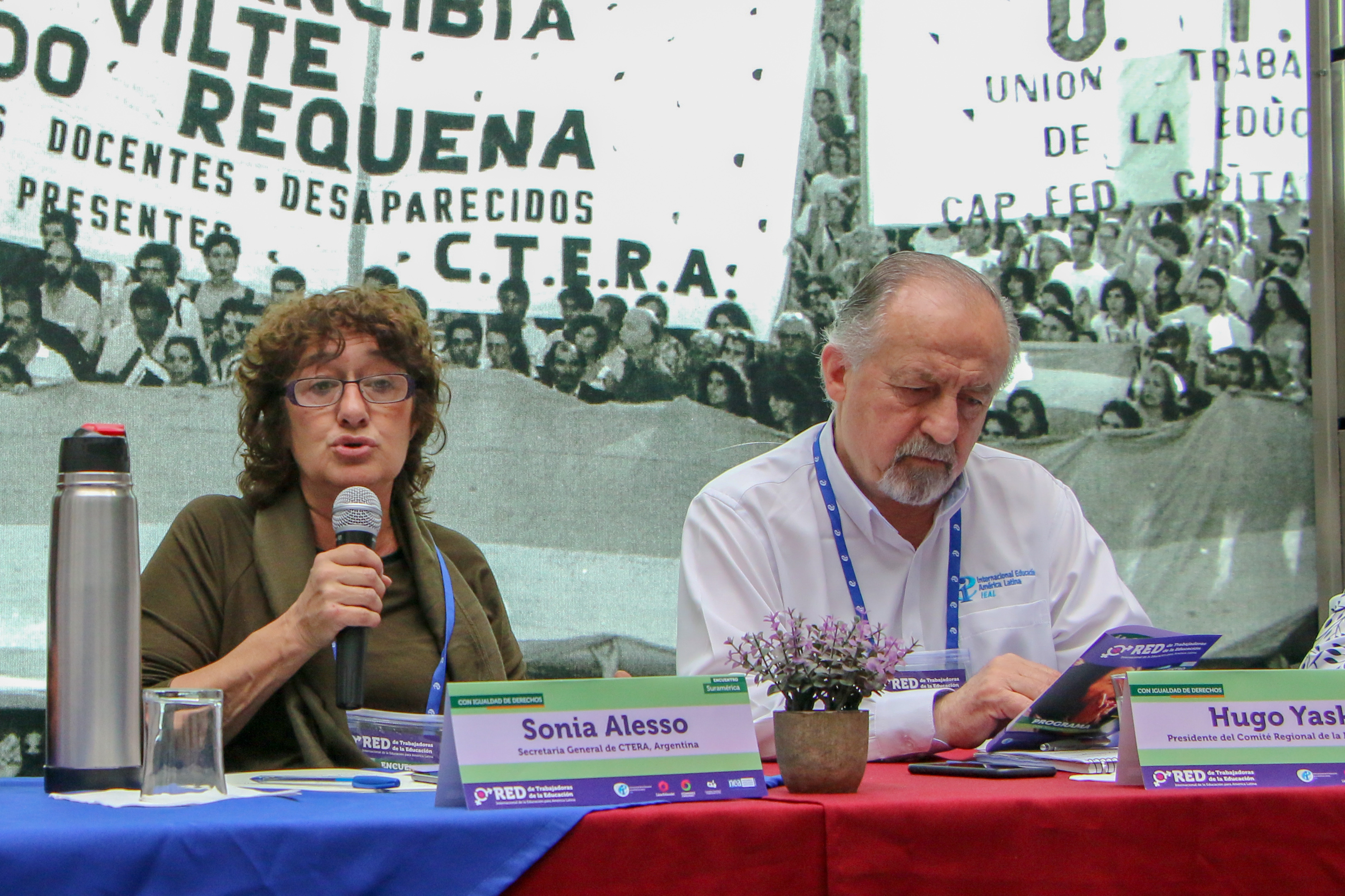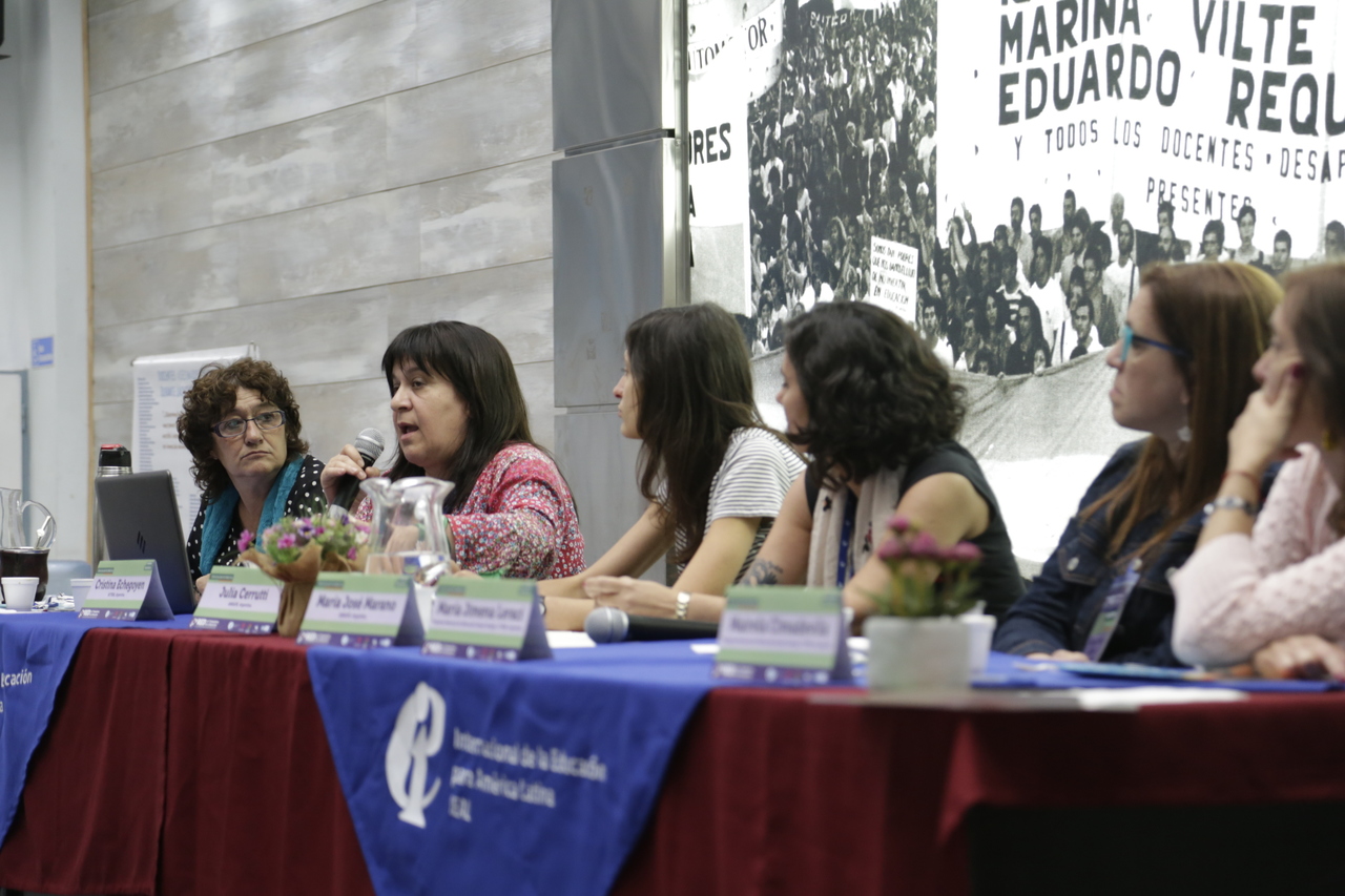 En el primer panel "Coyuntura Nacional e Internacional", expusieron Sonia Alesso, Secretaria General de CTERA y Miembro del Comité Ejecutivo de la IE; Hugo Yasky, Presidente de la IEAL; Fátima Silva, CNTE Brasil, Vicepresidenta de la IEAL; y Yamile Socolovsky, Secretaria de Relaciones Internacionales de CONADU.