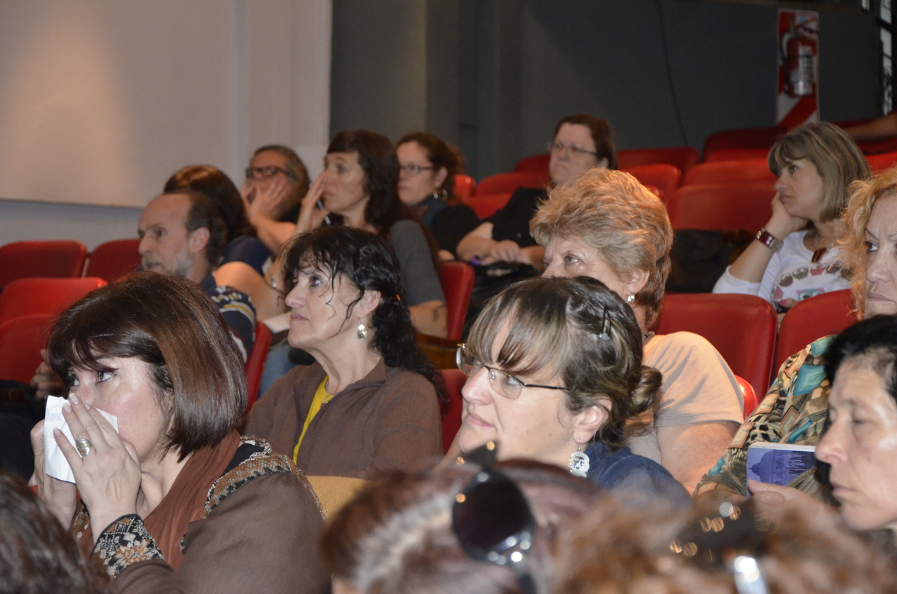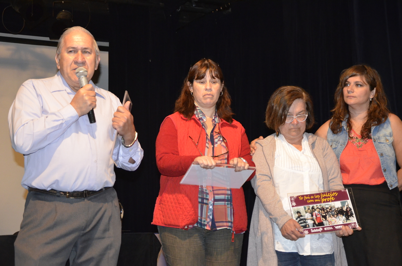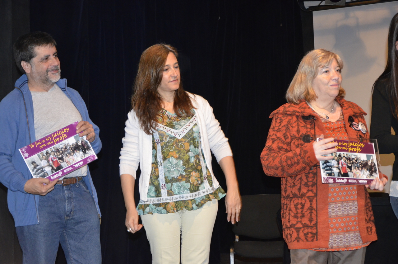 En medio de las exposiciones y de los homenajes, se realizaron proyecciones de videos, como el que ilustró la presentación del libro "Yo fui a los juicios con mi profe" en el marco de la Feria del Libro, el video que armó la UNIPE con la asistencia de los chicos a los juicios y el cierre llegó con el video interactivo del libro "Yo fui a los juicios con mi profe".