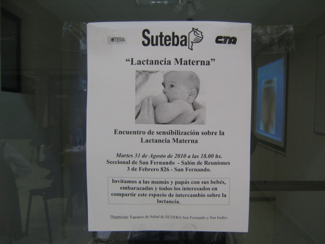 La primera se realizó el 27 de agosto en el Centro de Salud “María Esther Albano” de Tigre y la segunda, fue el 31 de agosto en el Salón de Reuniones de la Seccional San Fernando y la convocatoria fue mediante invitaciones vía mail a todos los afiliados y por teléfono a quienes durante el 2010 retiraron el ajuar para su bebé en SUTEBA. También se invitó a las mujeres embarazadas que controlan su embarazo en los Centros de Salud de San Fernando, San Isidro y Tigre, mamás y papás con sus bebés, familiares y a todos aquellos interesados en compartir este espacio de intercambio sobre lactancia.
