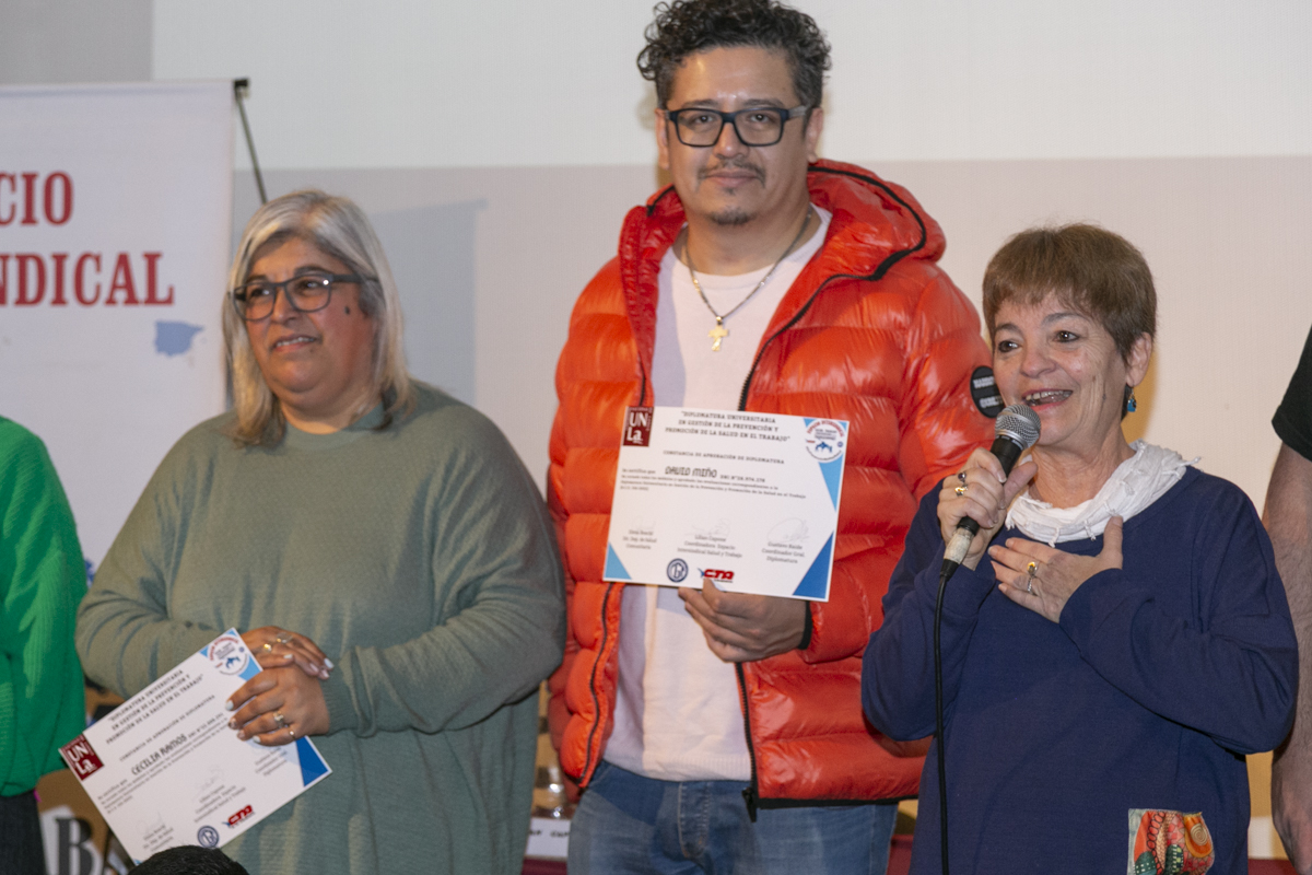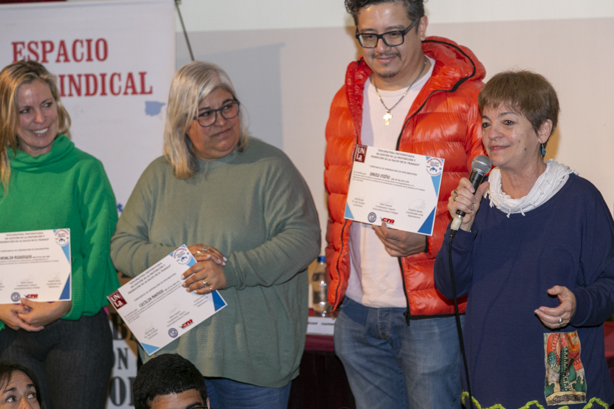 Lilian Capone, Secretaria de Salud Laboral de la CTA-T fue la oradora principal del encuentro y expresó: "Esta diplomatura marca un hito en la historia, ya que, después de los '70, se vuelve a hablar de salud y trabajo en ámbitos académicos. Se recibieron 134 compañerxs de 24 gremios, completando una etapa fundamental en la construcción colectiva de conocimiento, porque la importancia de la Intersindical es sentimos todxs Trabajadorxs, con el respeto del recorrido de cada Sindicato, camino que transitamos desde hace 7 años".