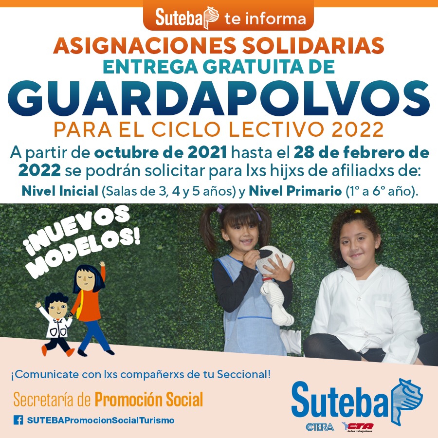 Los guardapolvos para hijxs de afiliadxs de Nivel Inicial (Salas de 3, 4 y 5 años) y de 1° a 6° Grado de la EPB, se podrán solicitar desde octubre de 2021 hasta el 28 de febrero de 2022.