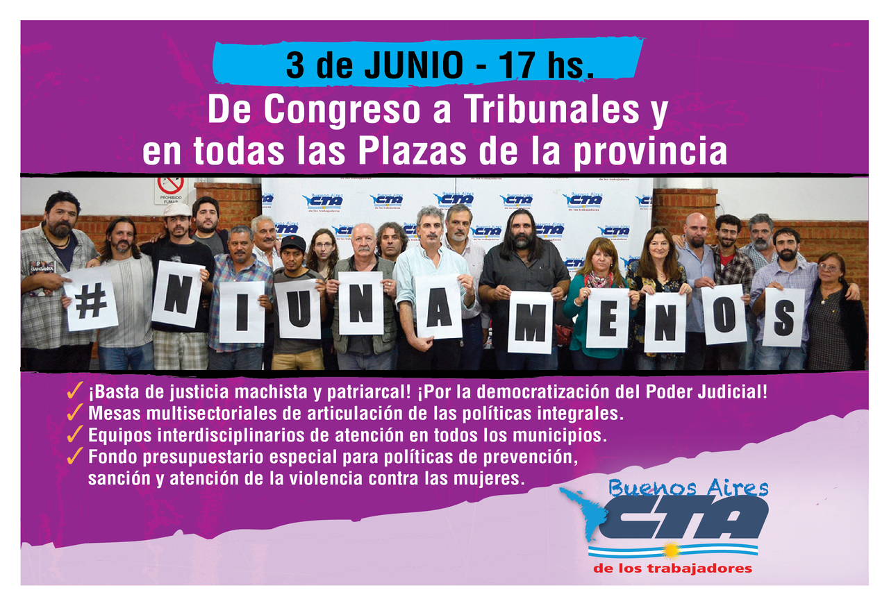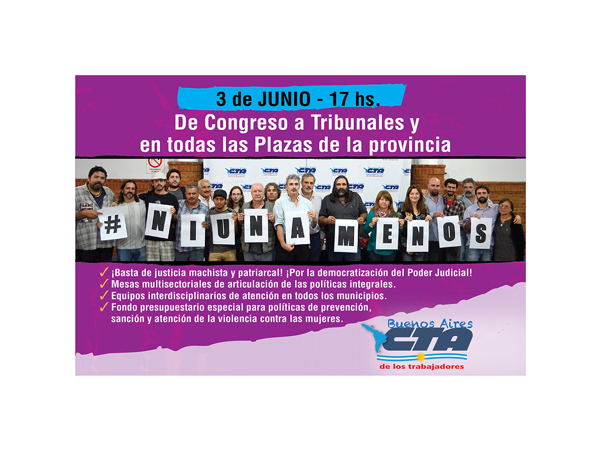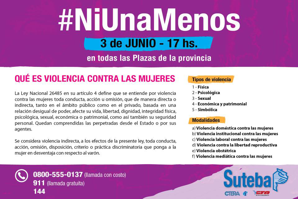 SUTEBA- CTERA -CTA se juntarán en la Plaza principal con esta consigna: Este 3 de Junio en todo el país gritamos ¡â€ª#NiUnaMenos‬!