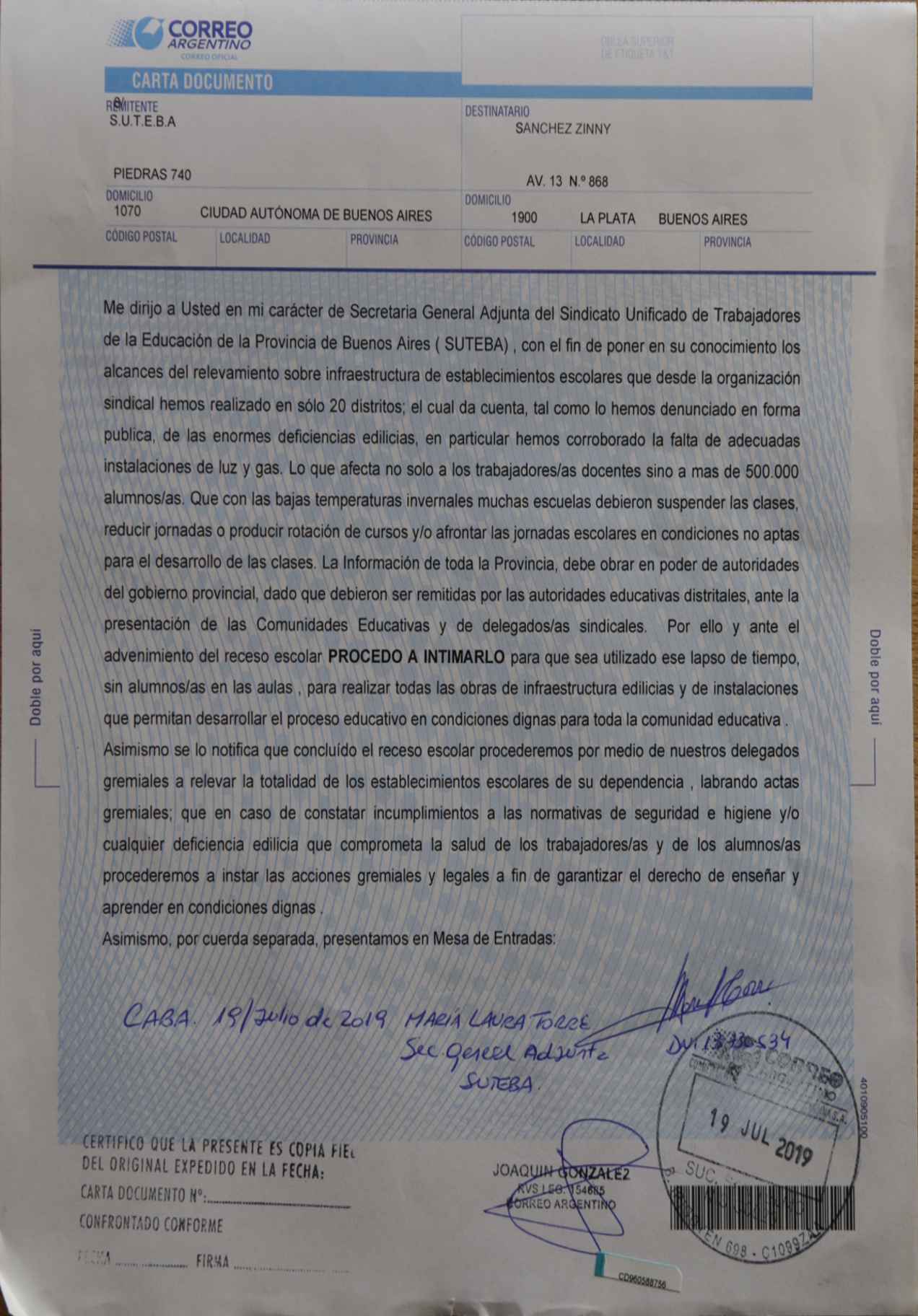En el día de la fecha, desde el SUTEBA enviamos una Carta Documento a la Dirección General de Cultura y Educación, para exigirle a las autoridades educativas que se hagan cargo de sus responsabilidades y resuelvan las urgentes problemáticas de Infraestructura, que afectan a las Escuelas de toda la provincia de Buenos Aires, en estos 15 días de receso escolar. ¡Basta de ajuste y desidia!