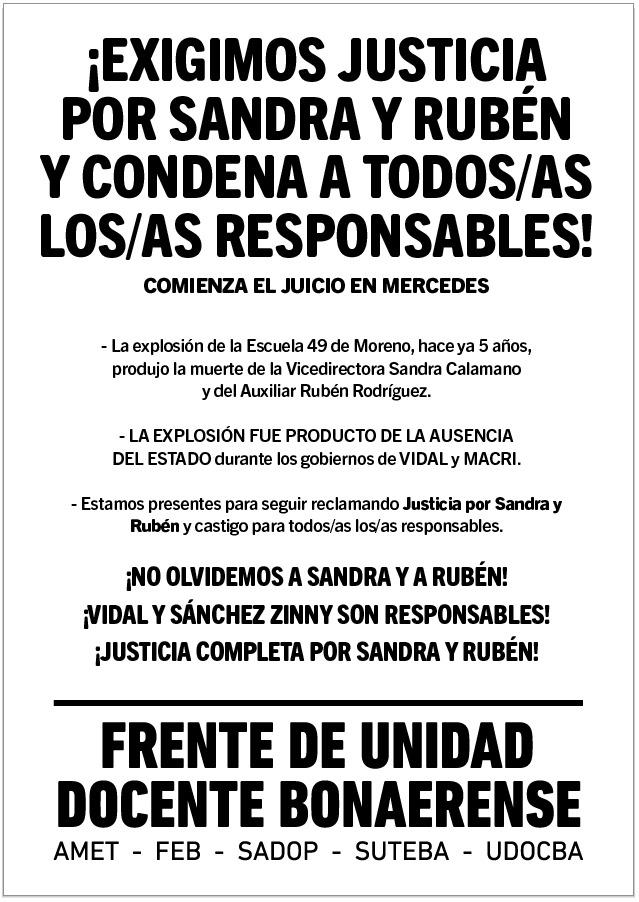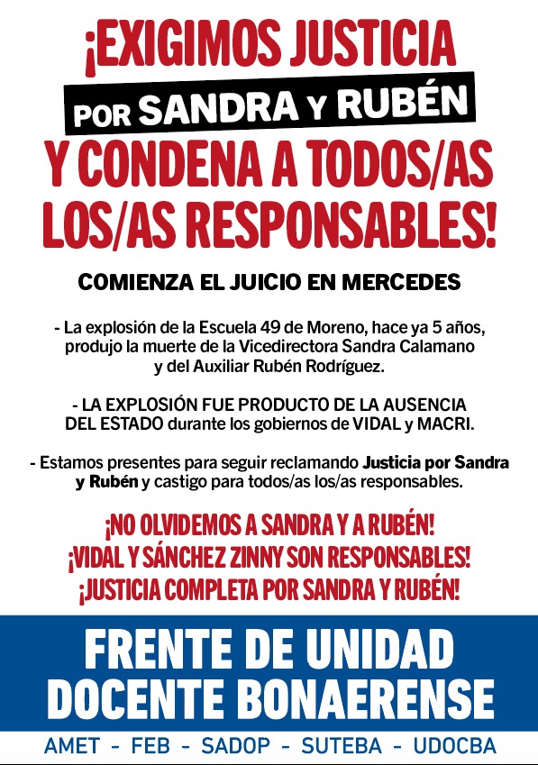 Este lunes 28 de agosto comenzó en Mercedes el Juicio por la explosión de la Escuela Nº 49 de Moreno que, hace ya 5 años, produjo las muertes de nuestrxs compañerxs Sandra Calamano y Rubén Rodríguez, Vicedirectora y Auxiliar de la Escuela.