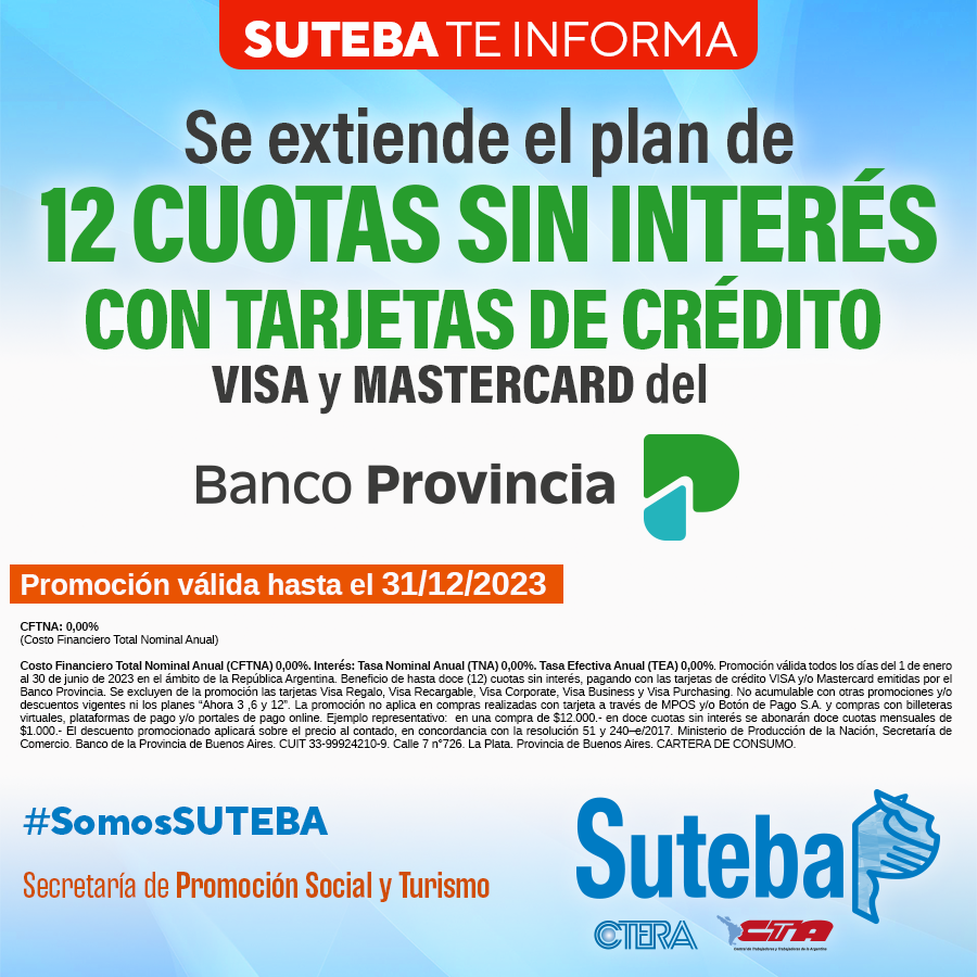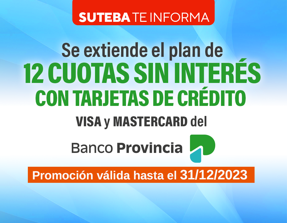 Desde el SUTEBA informamos con alegría que logramos extender el convenio de 12 cuotas sin interés con tarjetas Visa y Mastercard del Banco Provincia de Buenos Aires, en beneficio de todxs nuestrxs afiliadxs.