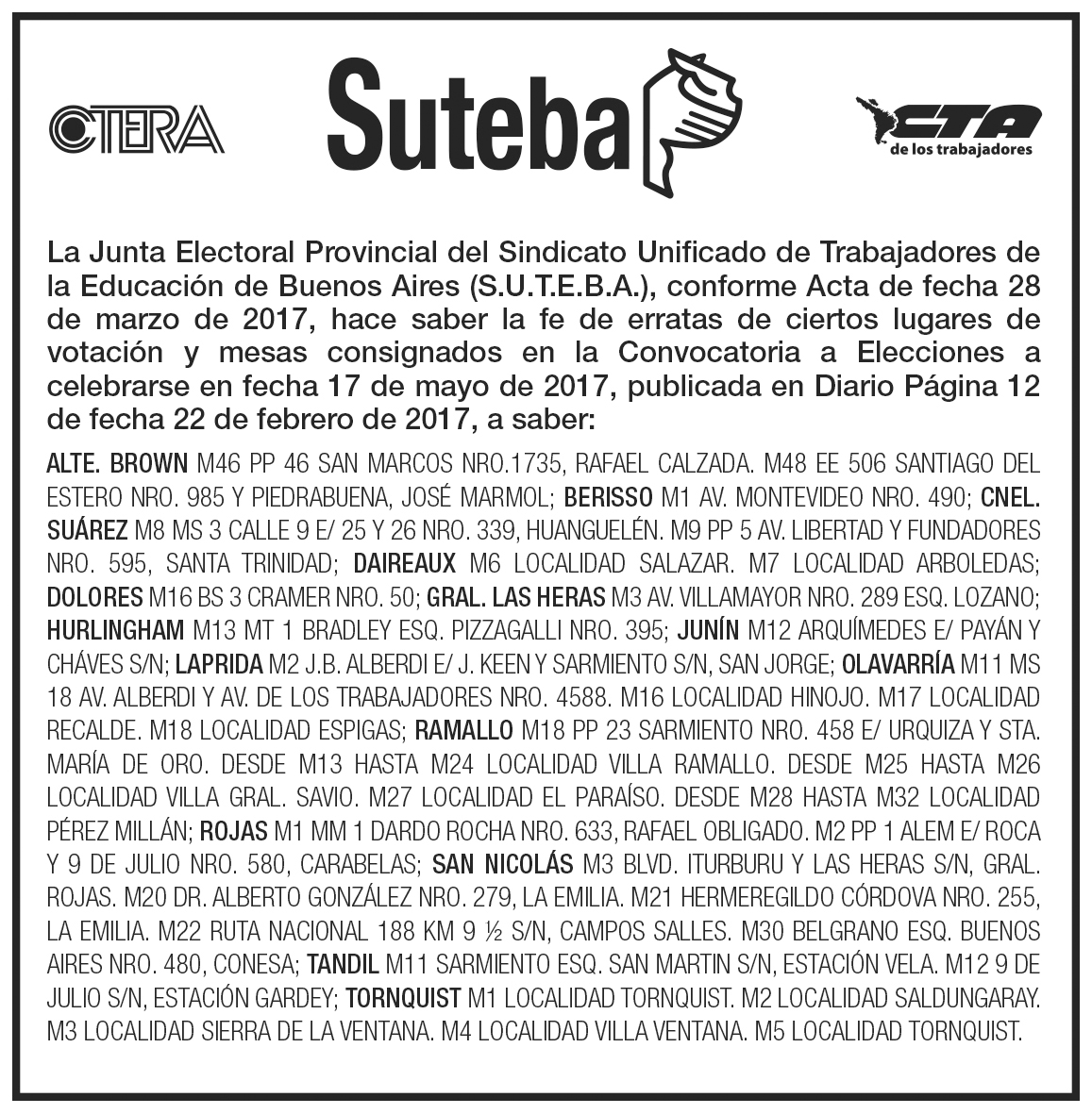 La Junta Electoral Provincial del Sindicato Unificado de Trabajadores de la Educación de Buenos Aires (S.U.T.E.B.A.), conforme Acta de fecha 28 de marzo de 2017, hace saber la fe de erratas de ciertos lugares de votación y mesas consignados en la Convocatoria a Elecciones a celebrarse en fecha 17 de mayo de 2017, publicada en Diario Página 12 de fecha 22 de febrero de 2017, a saber: