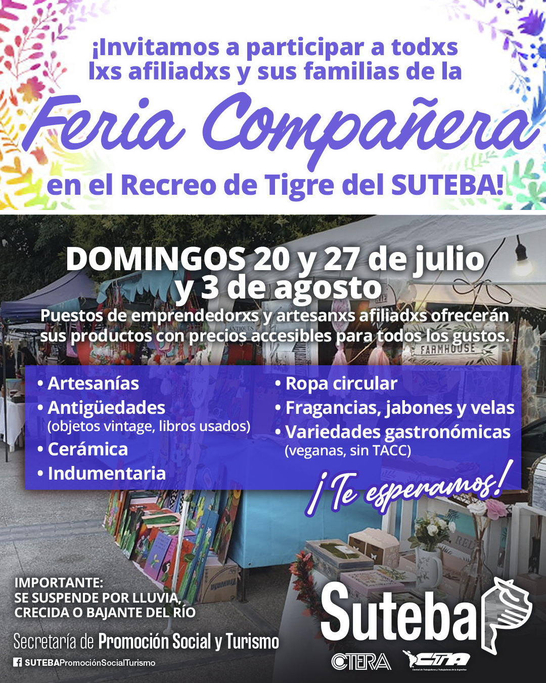 Invitamos a participar a afiliadxs y sus familias, de la Feria que se realizará en el Recreo de Tigre los domingos 20 y 27 de julio y 03 de agosto.