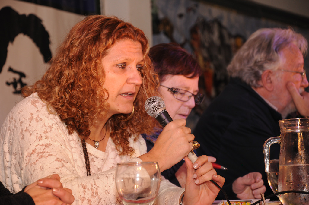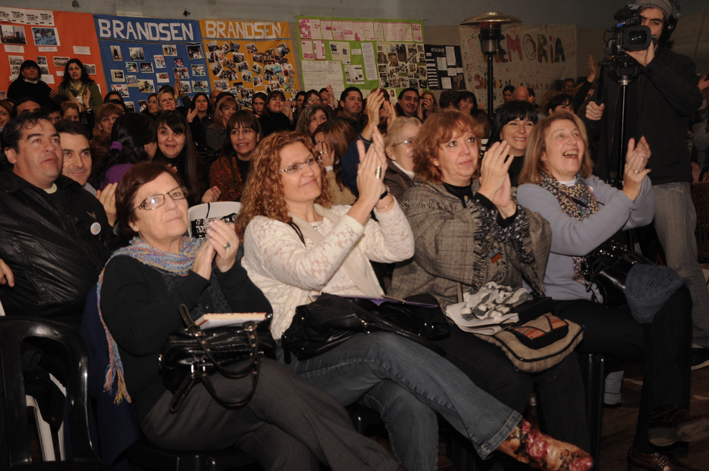 Acto seguido, tomó la palabra la compañera Cecilia Martinez, quien relacionó al SUTEBA con el rol de los pueblos a lo largo de la historia: “Los pueblos recorren y escriben su propia historia y nosotros lo que tratamos es ser protagonistas en ese camino”. Además, contó algunas anécdotas del SUTEBA y de su nacimiento. En 1976 con el golpe militar, las dos docentes que quedaban en el local de Morón tuvieron que cerrar porque no les renovaban el contrato (una de esas docentes era Cecilia Martinez), entonces empezaron a repartir por distintos lugares los muebles del local. Un escritorio lo llevaron a la Fraternidad (Sindicato de los Ferroviarios) y le pidieron que lo guardaran: “Estuvimos casi 7 años sin local, cuando logramos, en el ’83, alquilar un localcito, empezamos a rescatar los muebles. Fuimos a buscar el escritorio a la Fraternidad pensando que ya no iban a tenerlo. Cuando llegamos le contamos a un compañero que había ahí quienes éramos y que hacía 7 años habíamos dejado un escritorio allí, a lo que el compañero inmediatamente contestó: ‘¿El escritorio de los maestros? Si, lo tenemos guardado’. Entonces, nos dimos cuenta que no nos habíamos equivocado, que ese era el camino que queríamos seguir, junto a los laburantes”.