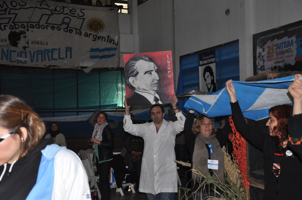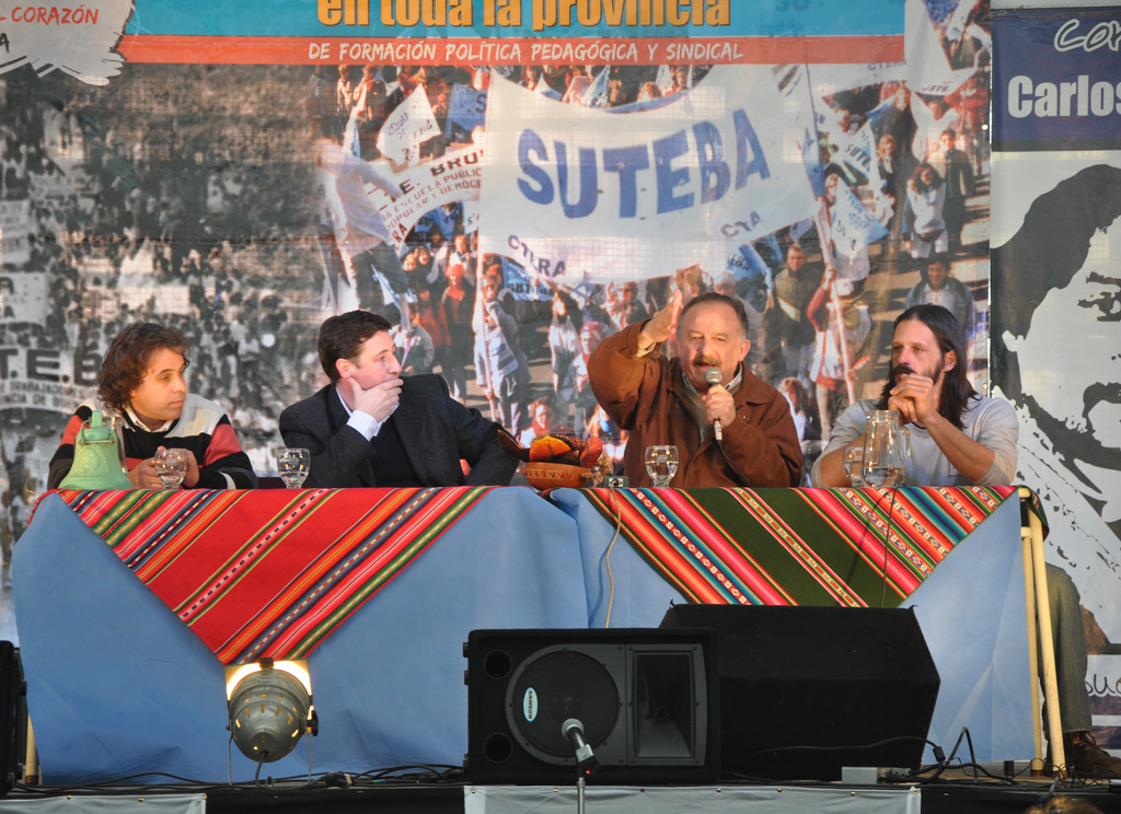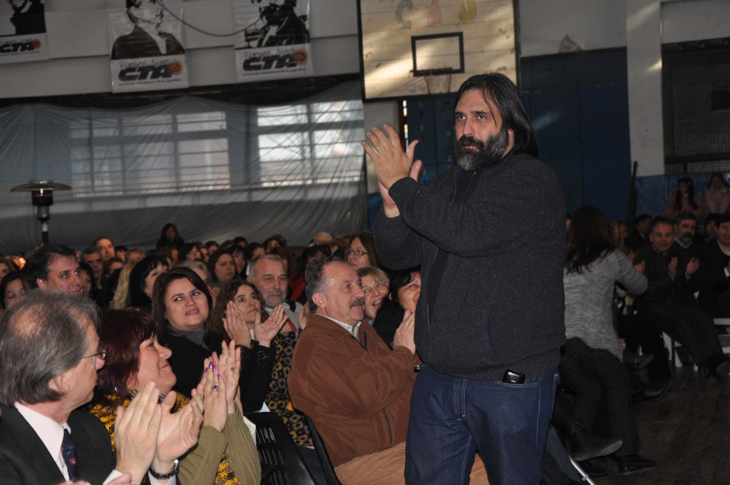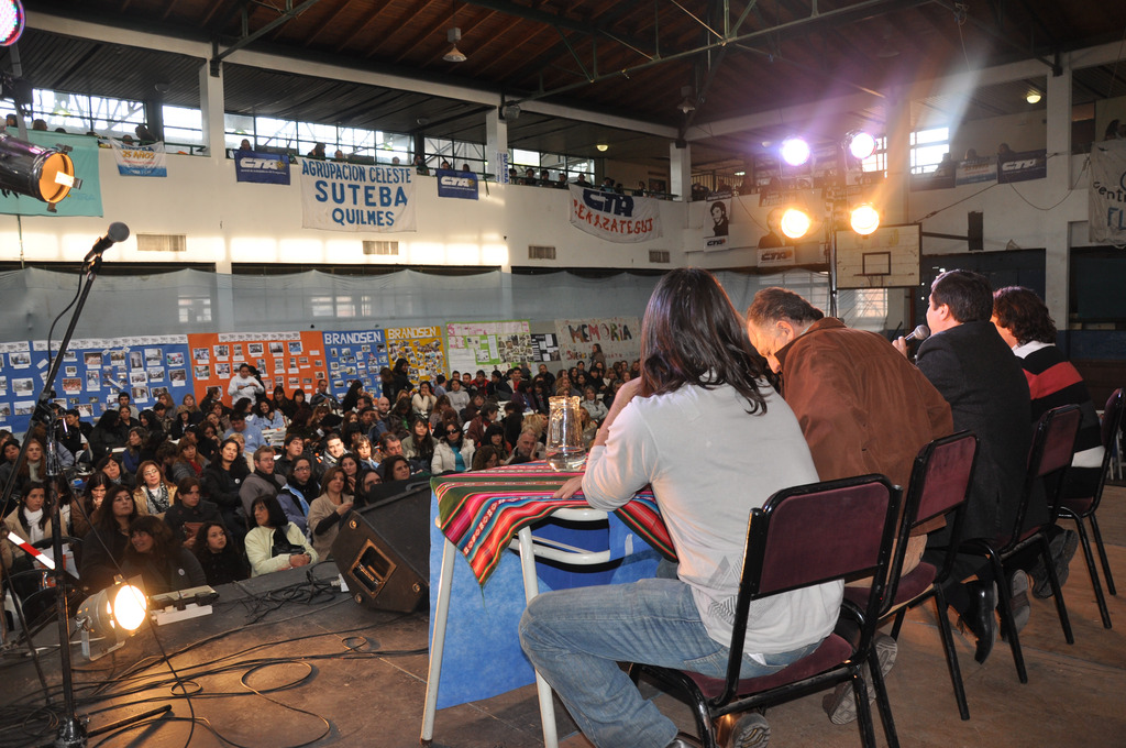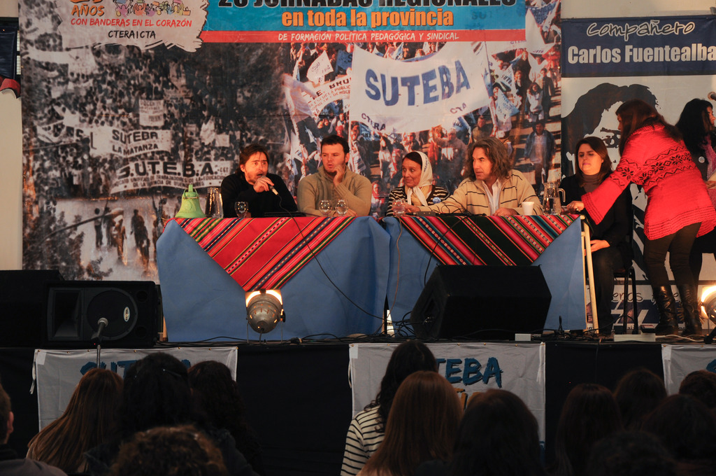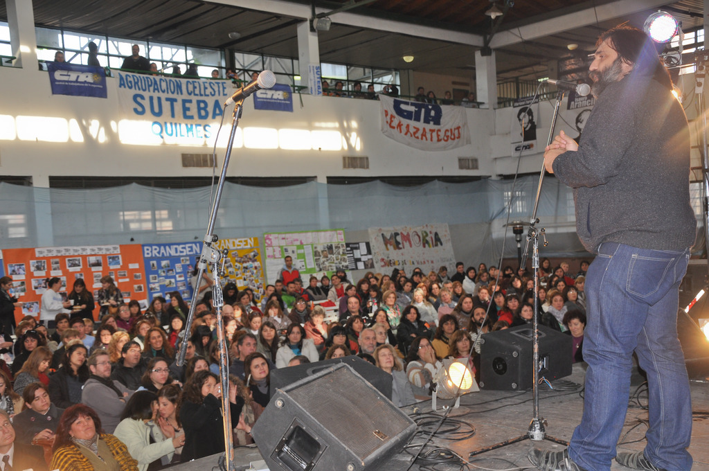 En tercer lugar, fue el turno de Charly Pisoni. Elogió al SUTEBA por “siempre estar de pie y siempre ser coherente, porque los docentes siempre estuvieron donde tenían que estar y donde se los necesitaba.” Pisoni narró la historia de la formación de HIJOS allá por 1995: “Cuando nosotros nos formamos, realmente pensábamos que era imposible llegar a este momento que estamos viviendo hoy en materia de derechos humanos.” Luego, dijo: “A mi me toco vivir, un momento muy especial en mi vida y que nunca pensé que iba a llegar, que fue la sentencia a los genocidas que secuestraron, torturaron y desaparecieron a mis papás Rolando Pisoni e Irene Bellocchio.” Charly sostuvo que muchas cosas de las que parecían imposibles se van haciendo posibles y festejó dos de las grandes victorias que tienen que ver con los derechos humanos: “Una es que hoy los pibes que nacen no mueren en la pobreza, sino que tienen una Asignación Universal por Hijo, y esa es una de las grandes victorias de este momento histórico que hemos conquistados todos, principalmente la CTA que lo ha impulsado desde siempre. Y por otro lado, otra gran victoria, que no hubiera sido posible sin la voluntad política de los gobiernos de Néstor y Cristina, y es la no represión a la protesta social, porque es, justamente, el respeto al derecho a la vida que es el derecho más fundamental que hoy se está tratando de tutelar desde el Estado. Esa orden de decirle a las fuerzas de seguridad: las marchas, sean de nuestro tinte ideológico o de otro, como ha sucedido con los cortes que hicieron los ruralistas, no se deben reprimir, no se deben usar armas de fuego porque no queremos más muertes.” Finalizó diciendo: “Estos logros que hemos conquistado, debemos seguir profundizándolos. Vamos por más.”