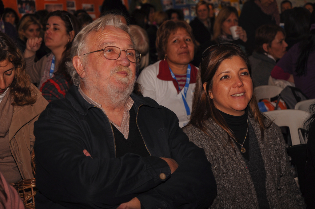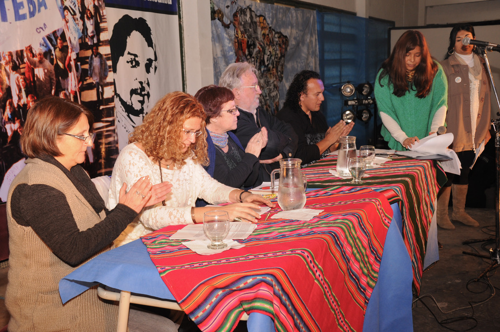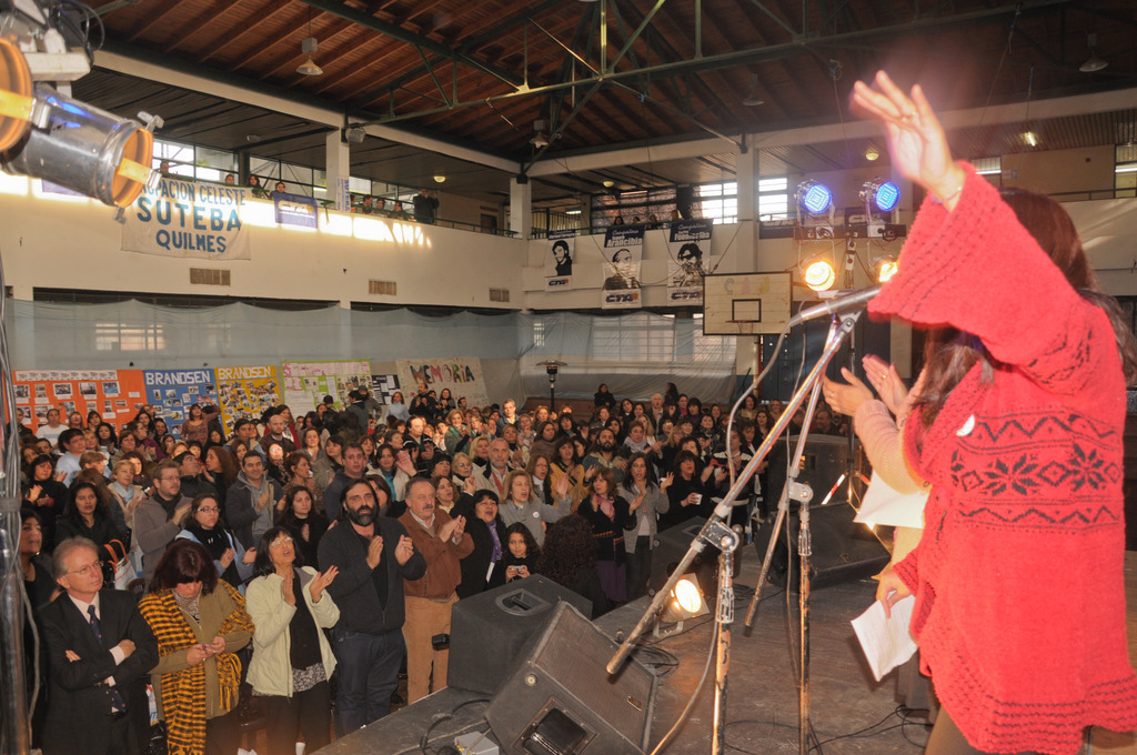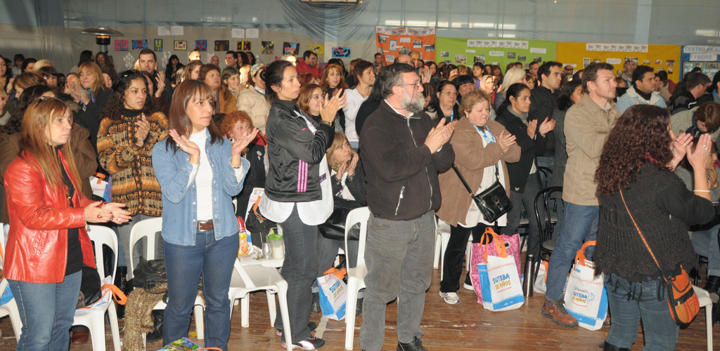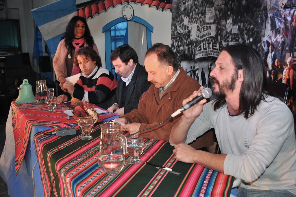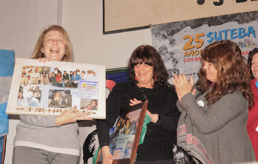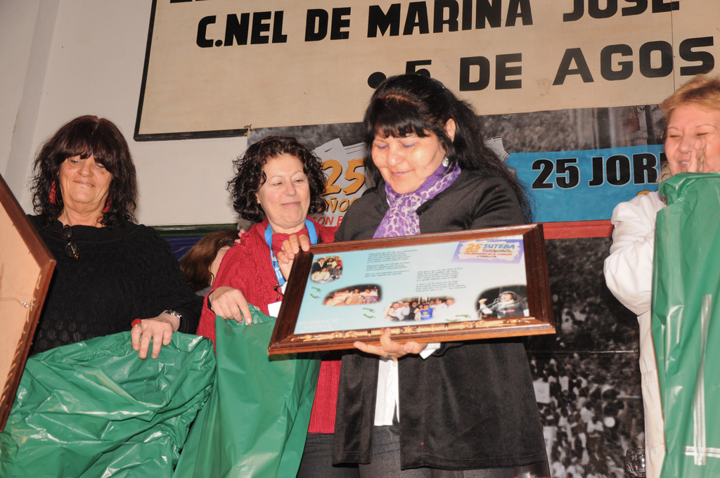 Acto seguido, tomó la palabra la compañera Cecilia Martinez, quien relacionó al SUTEBA con el rol de los pueblos a lo largo de la historia: “Los pueblos recorren y escriben su propia historia y nosotros lo que tratamos es ser protagonistas en ese camino”. Además, contó algunas anécdotas del SUTEBA y de su nacimiento. En 1976 con el golpe militar, las dos docentes que quedaban en el local de Morón tuvieron que cerrar porque no les renovaban el contrato (una de esas docentes era Cecilia Martinez), entonces empezaron a repartir por distintos lugares los muebles del local. Un escritorio lo llevaron a la Fraternidad (Sindicato de los Ferroviarios) y le pidieron que lo guardaran: “Estuvimos casi 7 años sin local, cuando logramos, en el ’83, alquilar un localcito, empezamos a rescatar los muebles. Fuimos a buscar el escritorio a la Fraternidad pensando que ya no iban a tenerlo. Cuando llegamos le contamos a un compañero que había ahí quienes éramos y que hacía 7 años habíamos dejado un escritorio allí, a lo que el compañero inmediatamente contestó: ‘¿El escritorio de los maestros? Si, lo tenemos guardado’. Entonces, nos dimos cuenta que no nos habíamos equivocado, que ese era el camino que queríamos seguir, junto a los laburantes”.
