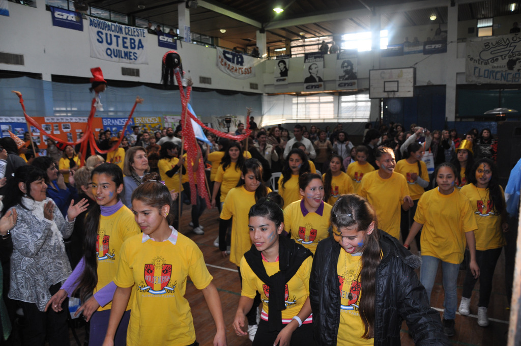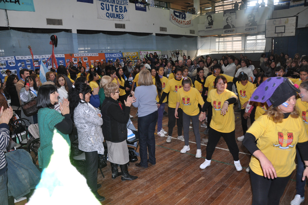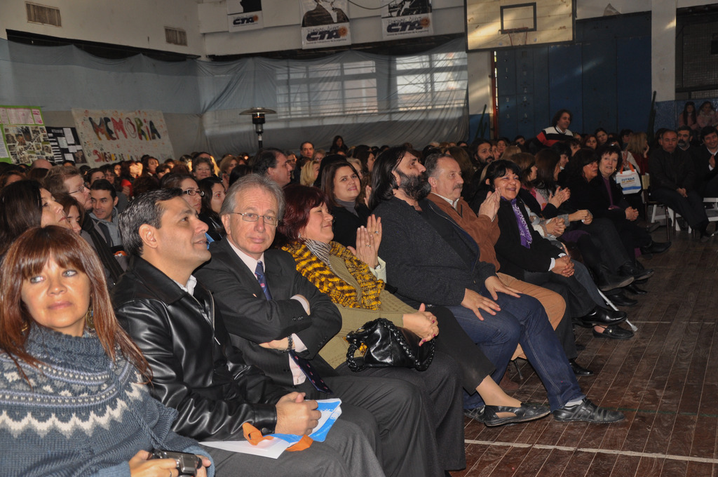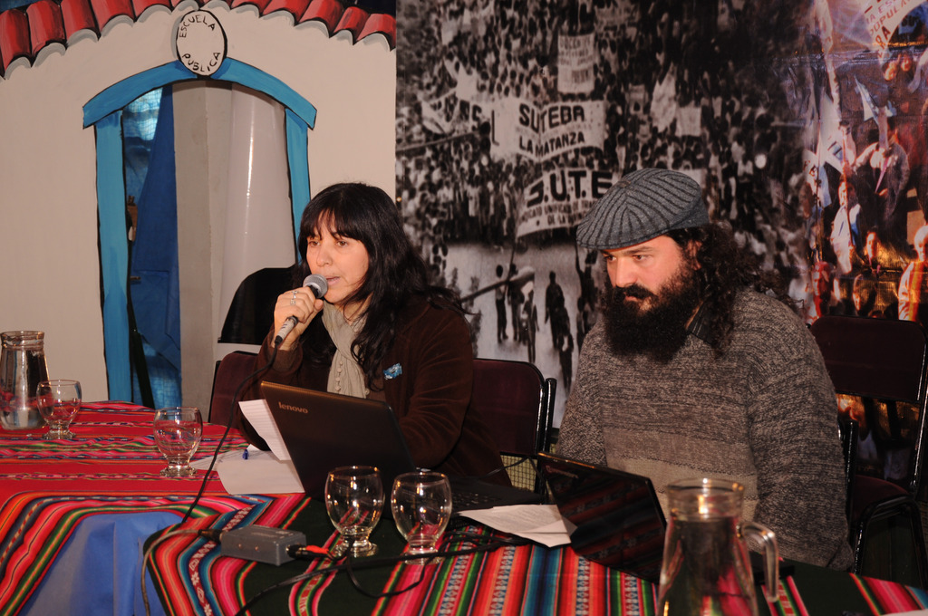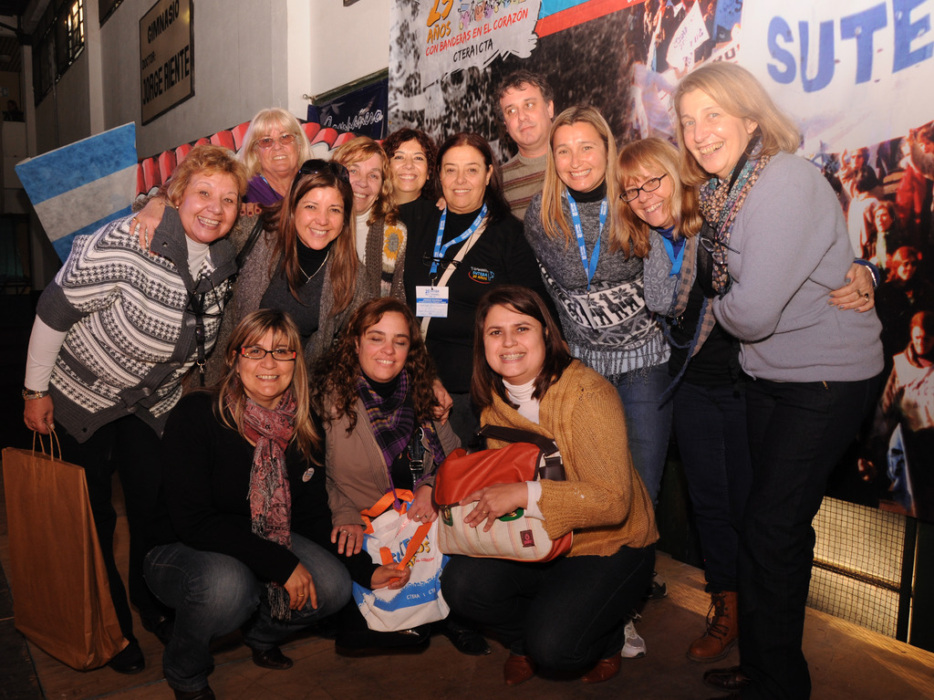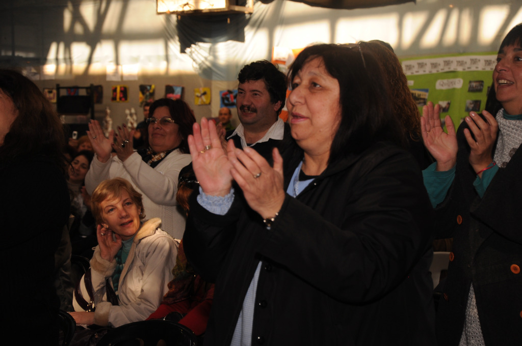 Acto seguido, tomó la palabra la compañera Cecilia Martinez, quien relacionó al SUTEBA con el rol de los pueblos a lo largo de la historia: “Los pueblos recorren y escriben su propia historia y nosotros lo que tratamos es ser protagonistas en ese camino”. Además, contó algunas anécdotas del SUTEBA y de su nacimiento. En 1976 con el golpe militar, las dos docentes que quedaban en el local de Morón tuvieron que cerrar porque no les renovaban el contrato (una de esas docentes era Cecilia Martinez), entonces empezaron a repartir por distintos lugares los muebles del local. Un escritorio lo llevaron a la Fraternidad (Sindicato de los Ferroviarios) y le pidieron que lo guardaran: “Estuvimos casi 7 años sin local, cuando logramos, en el ’83, alquilar un localcito, empezamos a rescatar los muebles. Fuimos a buscar el escritorio a la Fraternidad pensando que ya no iban a tenerlo. Cuando llegamos le contamos a un compañero que había ahí quienes éramos y que hacía 7 años habíamos dejado un escritorio allí, a lo que el compañero inmediatamente contestó: ‘¿El escritorio de los maestros? Si, lo tenemos guardado’. Entonces, nos dimos cuenta que no nos habíamos equivocado, que ese era el camino que queríamos seguir, junto a los laburantes”.