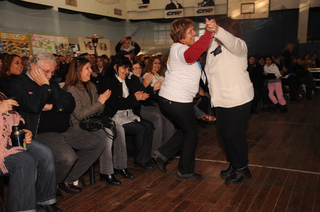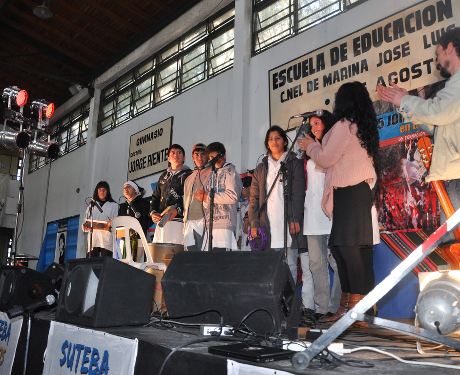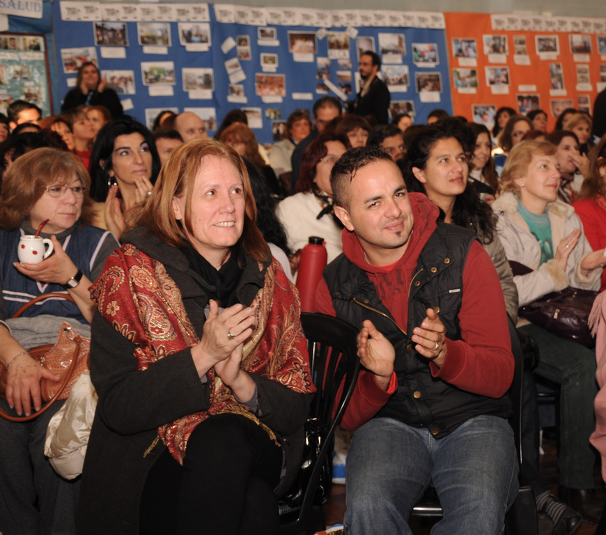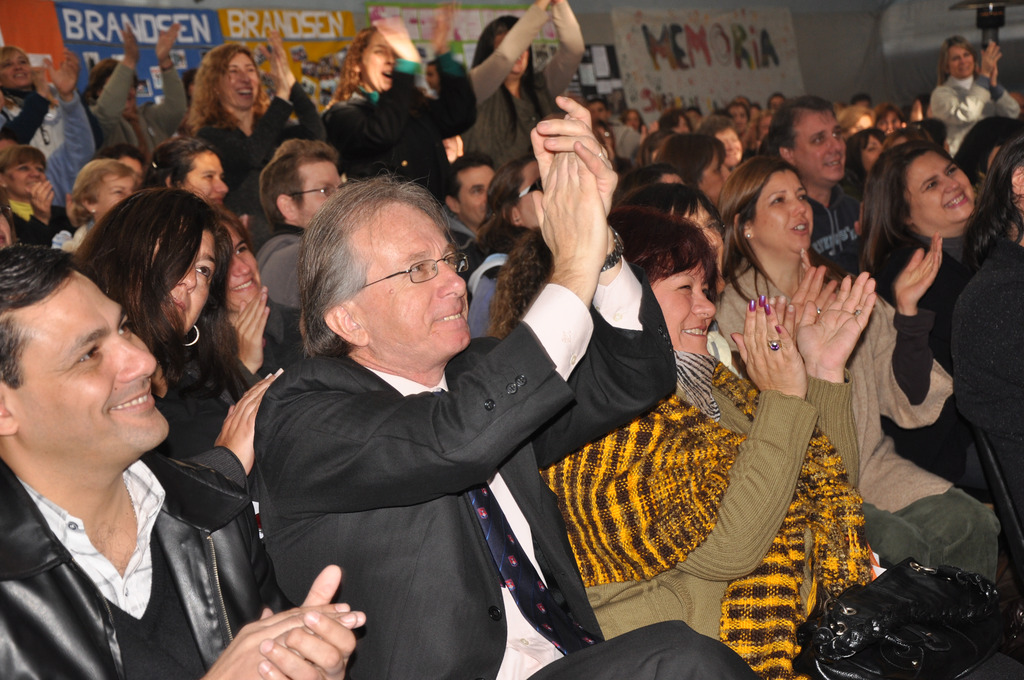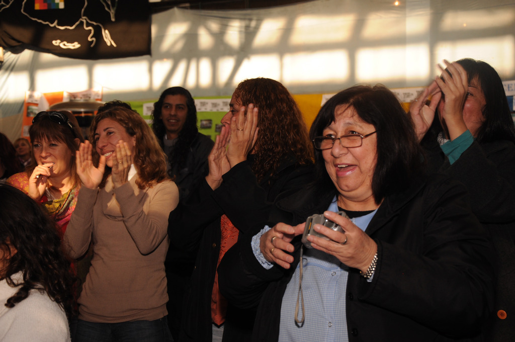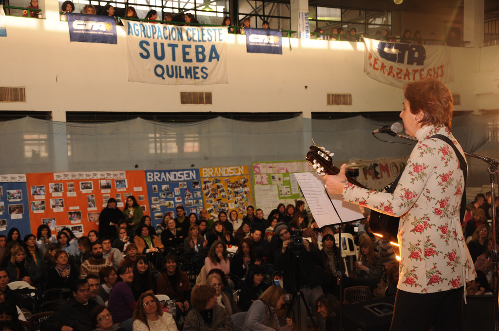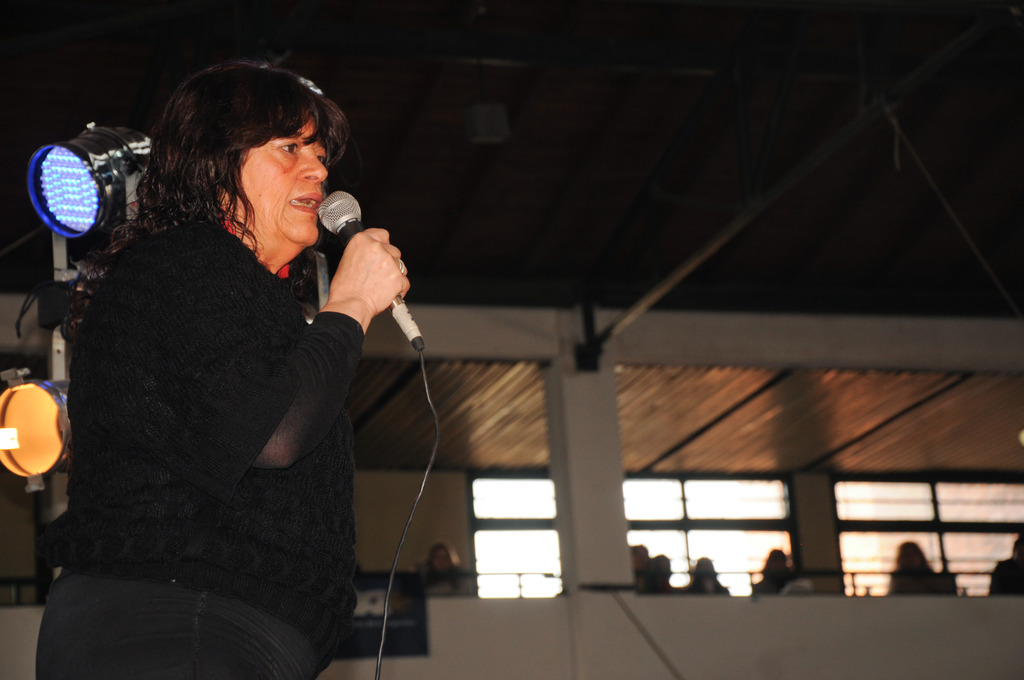Acto seguido, tomó la palabra la compañera Cecilia Martinez, quien relacionó al SUTEBA con el rol de los pueblos a lo largo de la historia: “Los pueblos recorren y escriben su propia historia y nosotros lo que tratamos es ser protagonistas en ese camino”. Además, contó algunas anécdotas del SUTEBA y de su nacimiento. En 1976 con el golpe militar, las dos docentes que quedaban en el local de Morón tuvieron que cerrar porque no les renovaban el contrato (una de esas docentes era Cecilia Martinez), entonces empezaron a repartir por distintos lugares los muebles del local. Un escritorio lo llevaron a la Fraternidad (Sindicato de los Ferroviarios) y le pidieron que lo guardaran: “Estuvimos casi 7 años sin local, cuando logramos, en el ’83, alquilar un localcito, empezamos a rescatar los muebles. Fuimos a buscar el escritorio a la Fraternidad pensando que ya no iban a tenerlo. Cuando llegamos le contamos a un compañero que había ahí quienes éramos y que hacía 7 años habíamos dejado un escritorio allí, a lo que el compañero inmediatamente contestó: ‘¿El escritorio de los maestros? Si, lo tenemos guardado’. Entonces, nos dimos cuenta que no nos habíamos equivocado, que ese era el camino que queríamos seguir, junto a los laburantes”.