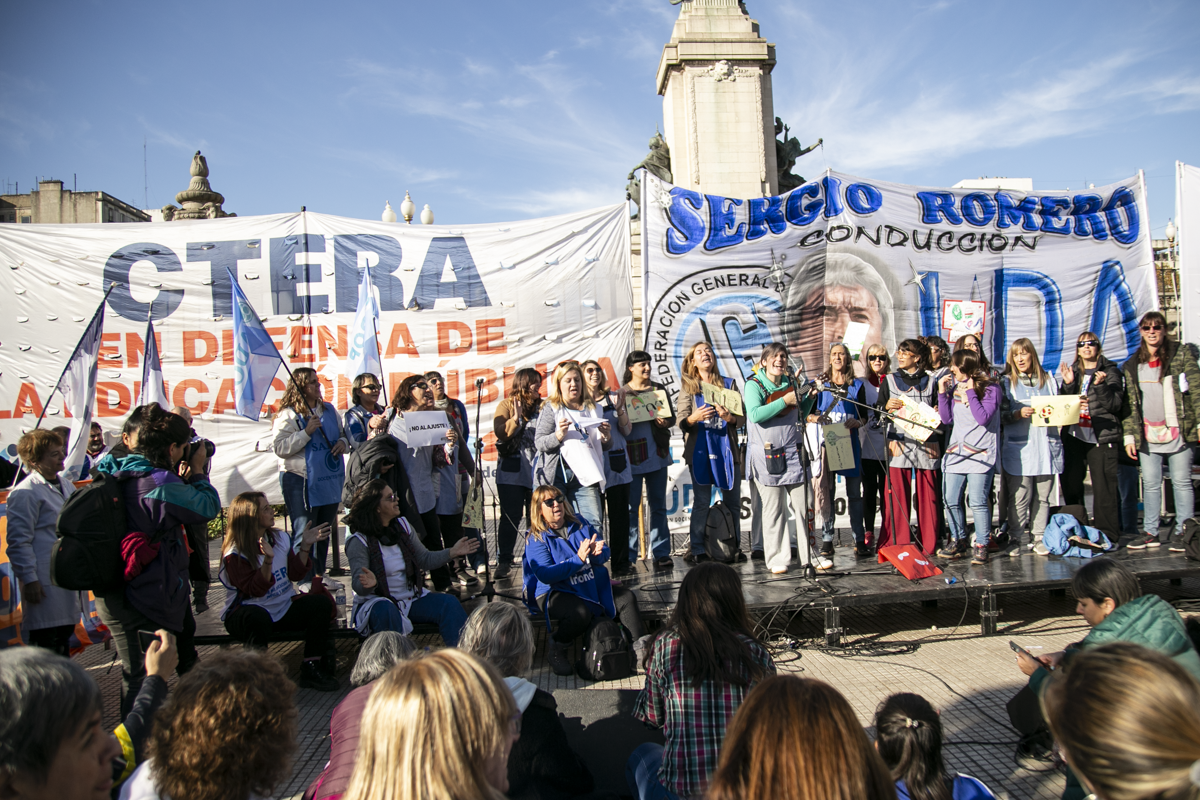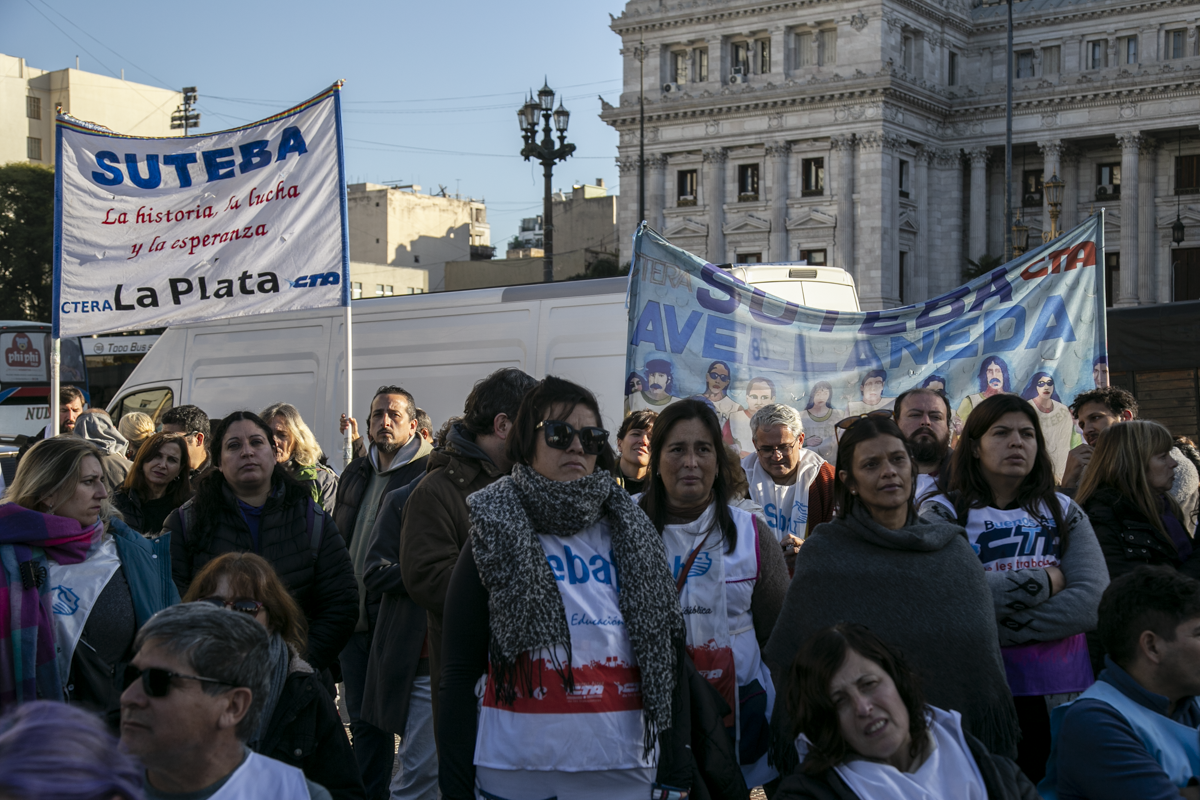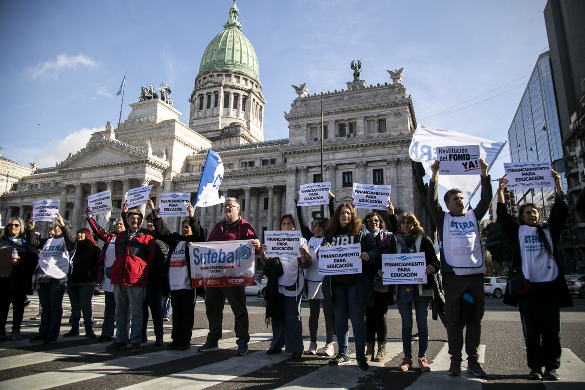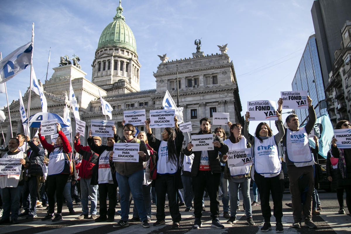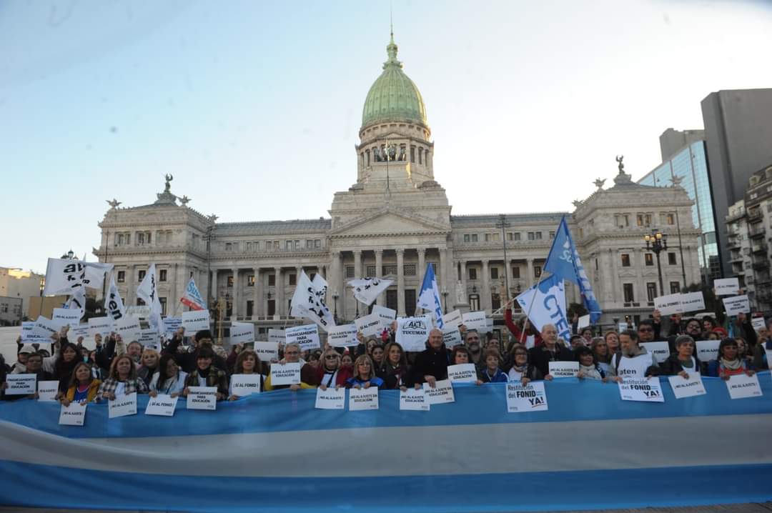 La concentración, convocada por CTERA y otros Sindicatos Docentes Nacionales de todos los Niveles y Modalidades (CONADU, SADOP, UDA, AMET, CEA), junto a los no docentes universitarios (FATUN), implica la continuidad del plan de lucha para exigir a lxs Diputadxs de la Comisión de Educación y Presupuesto la firma del dictamen para que se traten en el Congreso los proyectos de Ley de Financiamiento para Universidades Públicas y restitución del FONID.