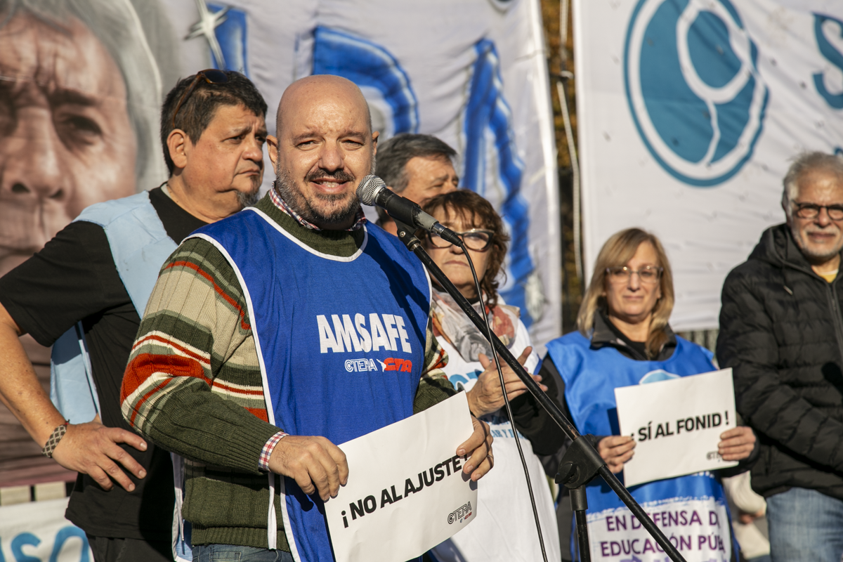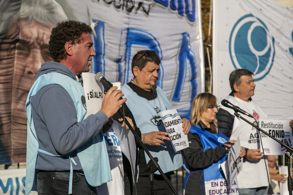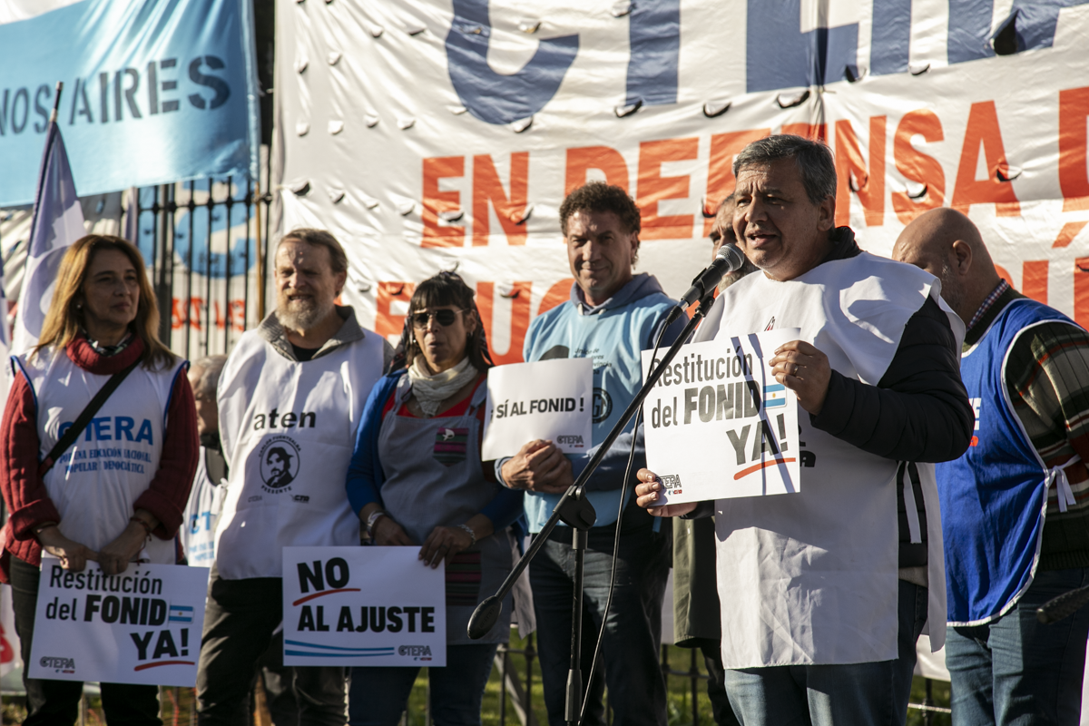 Por su parte, Roberto Baradel, Secretario General del SUTEBA y Adjunto de la CTERA, expresó: "Estamos acá nuevamente para pedir la restitución de la Ley del FONID. Hubo en recorte salarial a todxs lxs Docentes del país, no convocan a Paritaria Nacional. La expresión en Misiones es una muestra de esto. Reclamamos a lxs Diputadxs el dictamen para tratar estas leyes. Los fondos para Educación son innegociables, tanto el Estado nacional como las Provincias deben invertir en el Sistema Educativo".