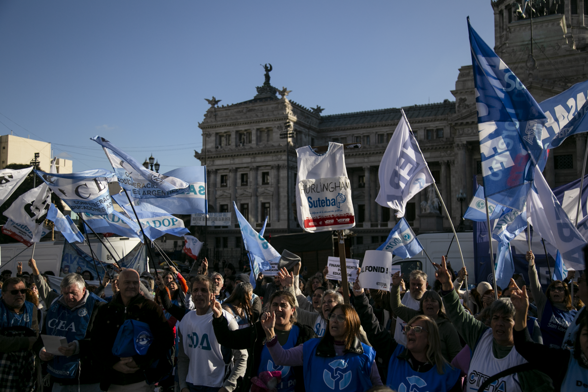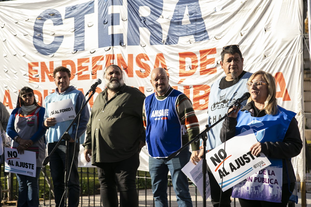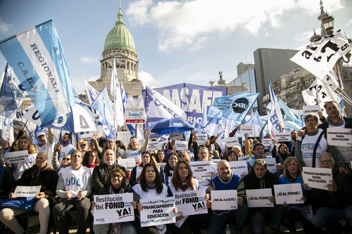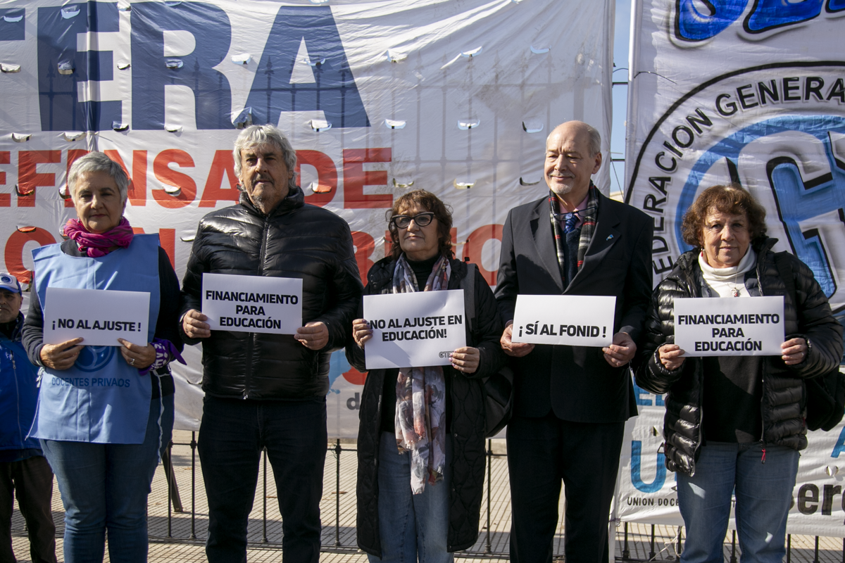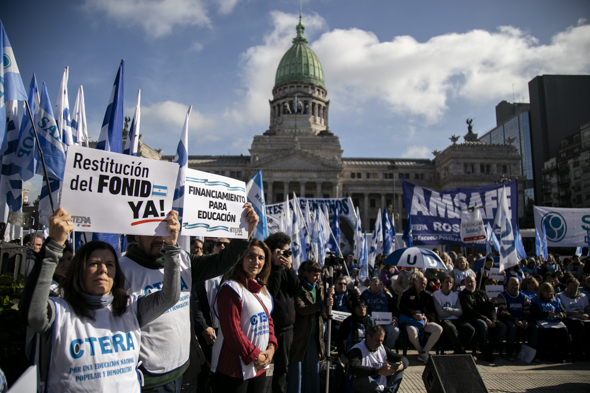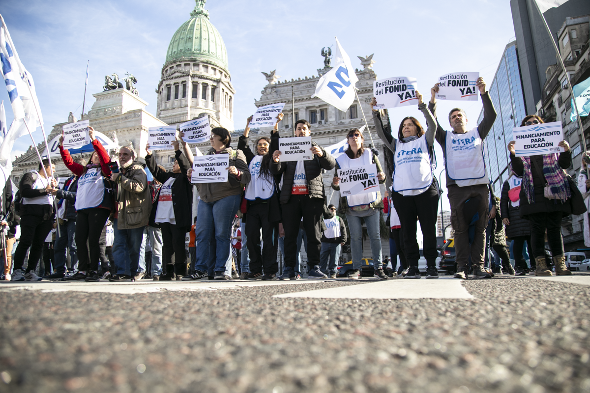 La concentración, convocada por CTERA y otros Sindicatos Docentes Nacionales de todos los Niveles y Modalidades (CONADU, SADOP, UDA, AMET, CEA), junto a los no docentes universitarios (FATUN), implica la continuidad del plan de lucha para exigir a lxs Diputadxs de la Comisión de Educación y Presupuesto la firma del dictamen para que se traten en el Congreso los proyectos de Ley de Financiamiento para Universidades Públicas y restitución del FONID.