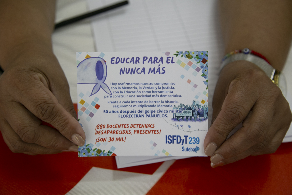 En el mes de la Memoria, a 50 años del golpe genocida, el Instituto Superior de Formación Docente y Técnico N° 239 descubrió una baldosa con el tradicional pañuelo de las Madres, recuperada por los Organismos de Derechos Humanos luego de haber sido quitada de Plaza de Mayo por el gobierno de Horacio Rodríguez Larreta.