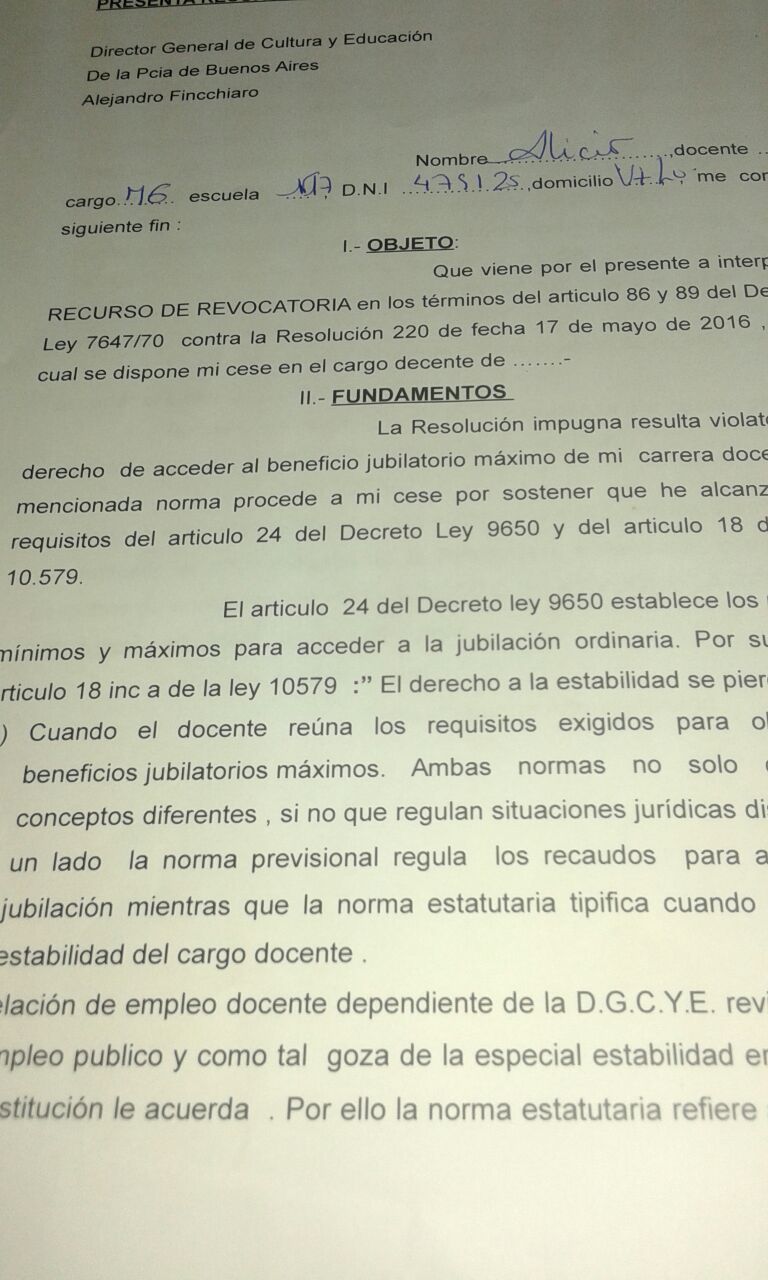 Se están llevando adelante en los distritos, acciones para frenar la medida: los docentes están interponiendo Recursos de Revocatoria impulsados por el sindicato contra la arbitraria resolución 220 de fecha 17/05 del Boletín Oficial, que impone la jubilación de oficio a más de 1500 compañeros, a los que no se les garantiza el beneficio máximo de la jubilación, cercenando sus derechos con un anticipo jubilatorio, cuyo monto se determinará en un 60% del sueldo básico, antigüedad y cifras remunerativas del último cargo desempeñado, sin aumentos, incentivo docente, ni aguinaldo.