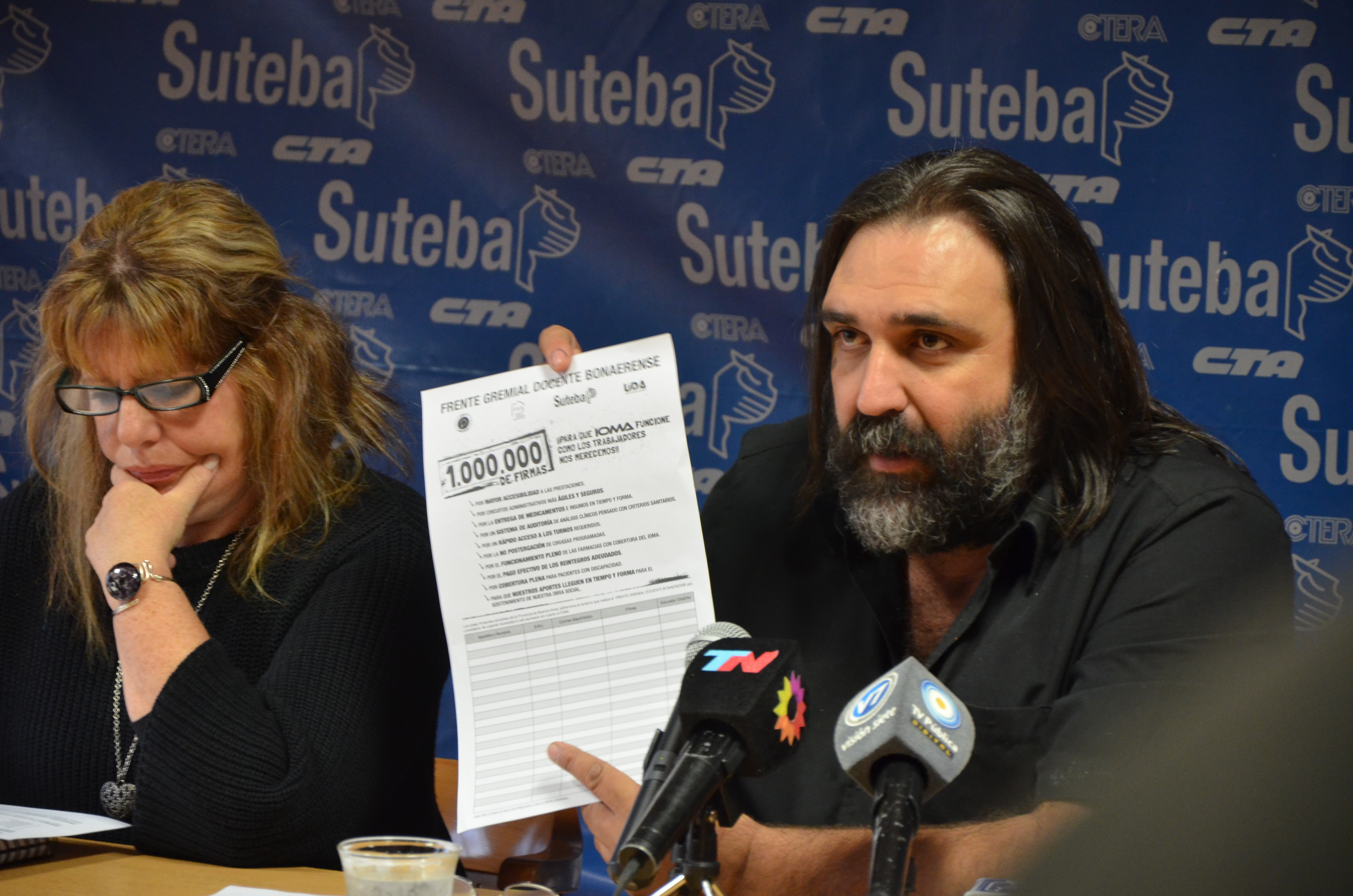 El SUTEBA lanzó la Campaña para juntar un millón de firmas para que el IOMA funcione como los trabajadores de la educación se lo merecen. El lanzamiento lo hicieron en conferencia de prensa el Secretario General del sindicato, Roberto Baradel, acompañado por Patricia Nisenbaum, Vocal Docente del IOMA, y Vilma Alvarado, Secretaria de Salud.