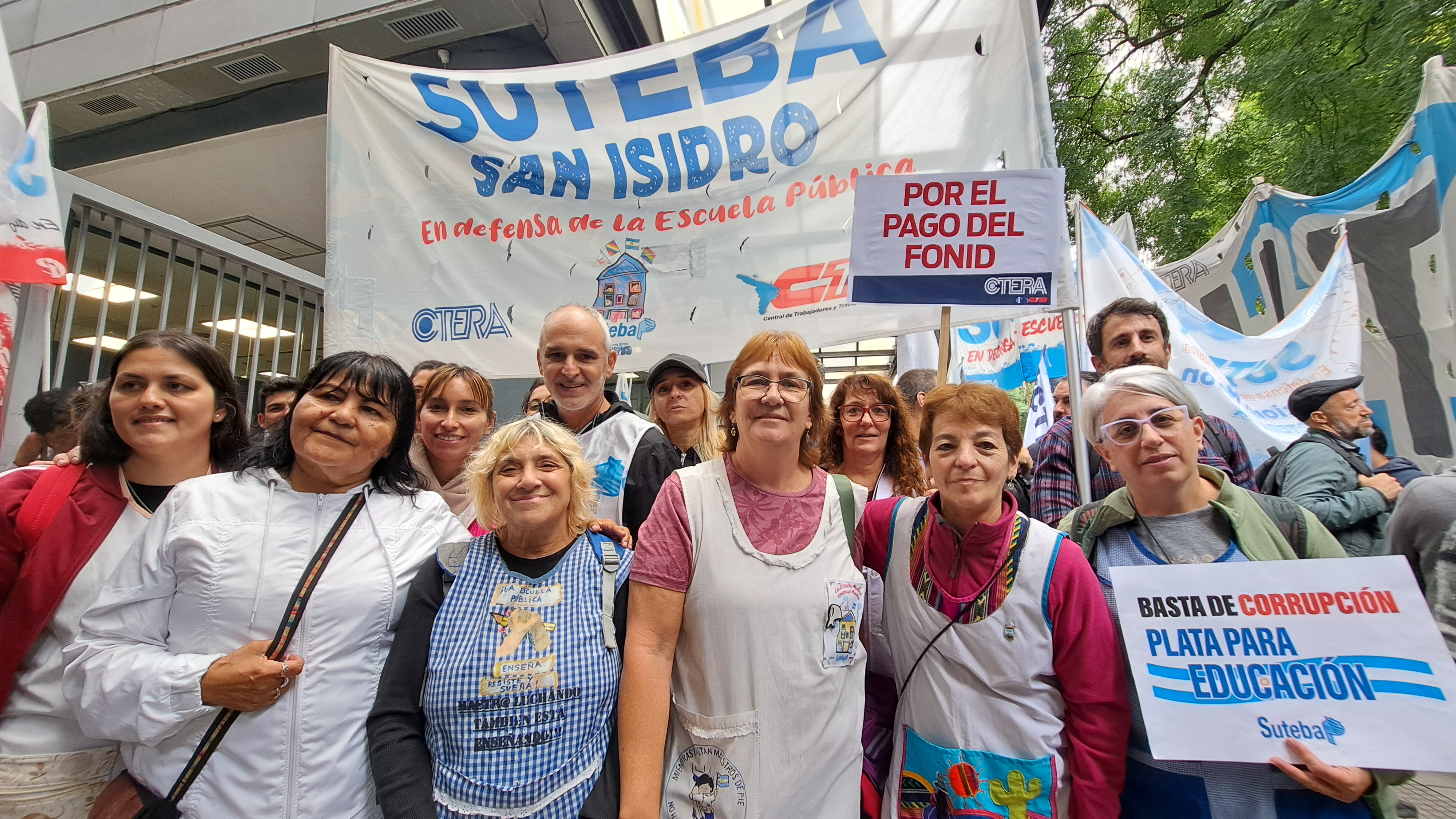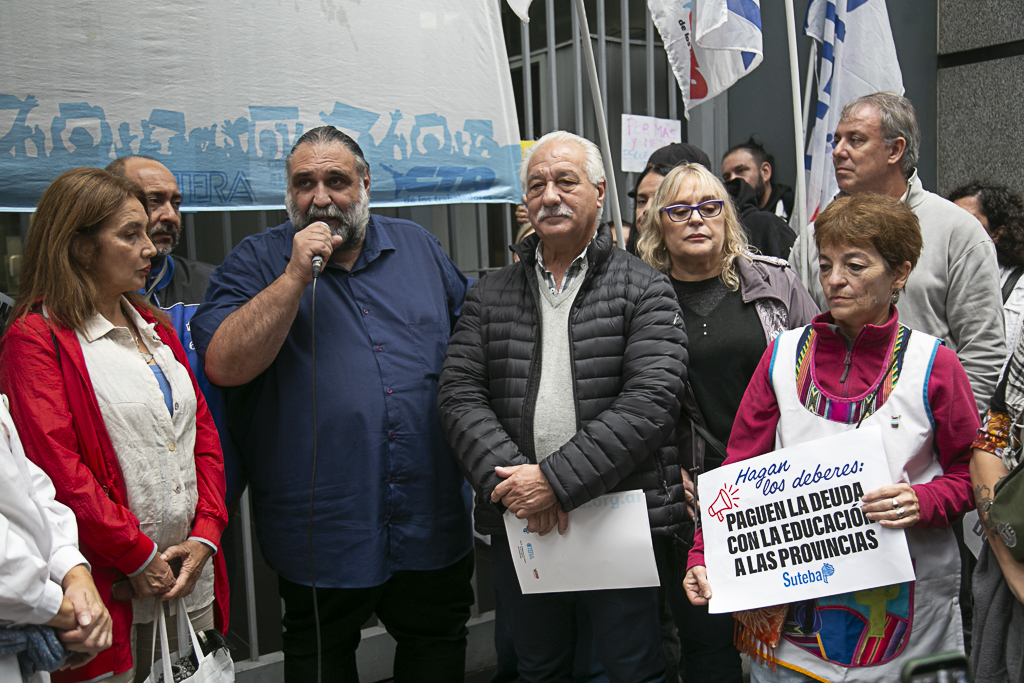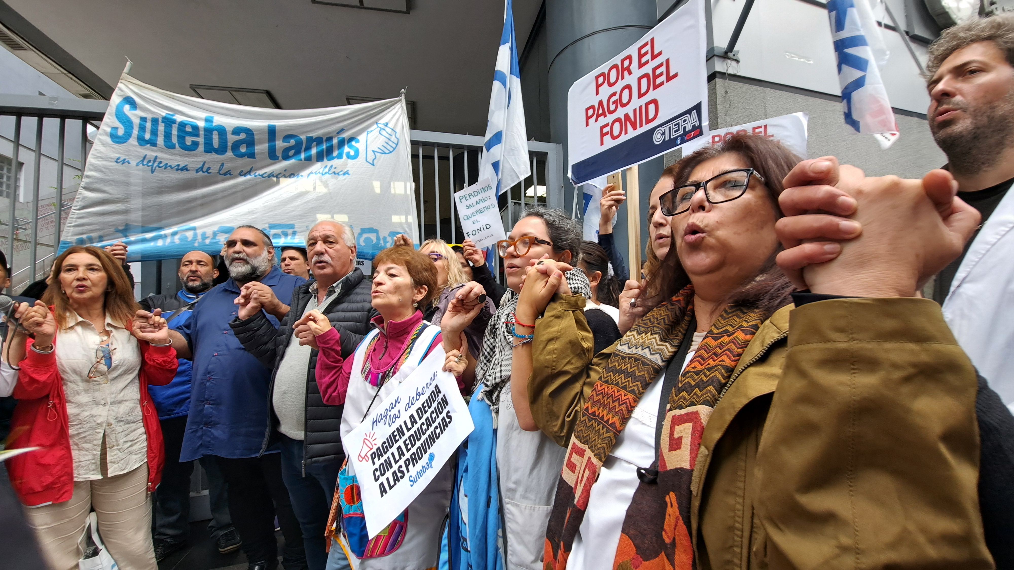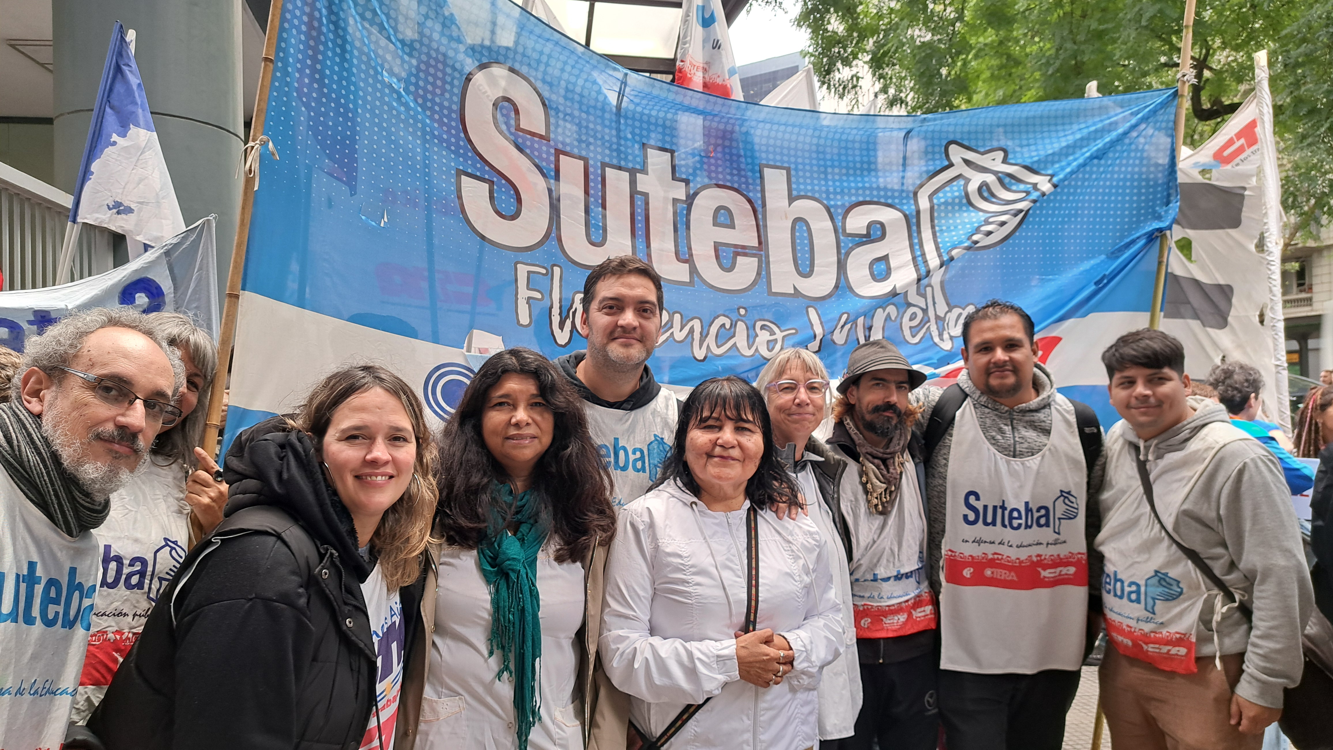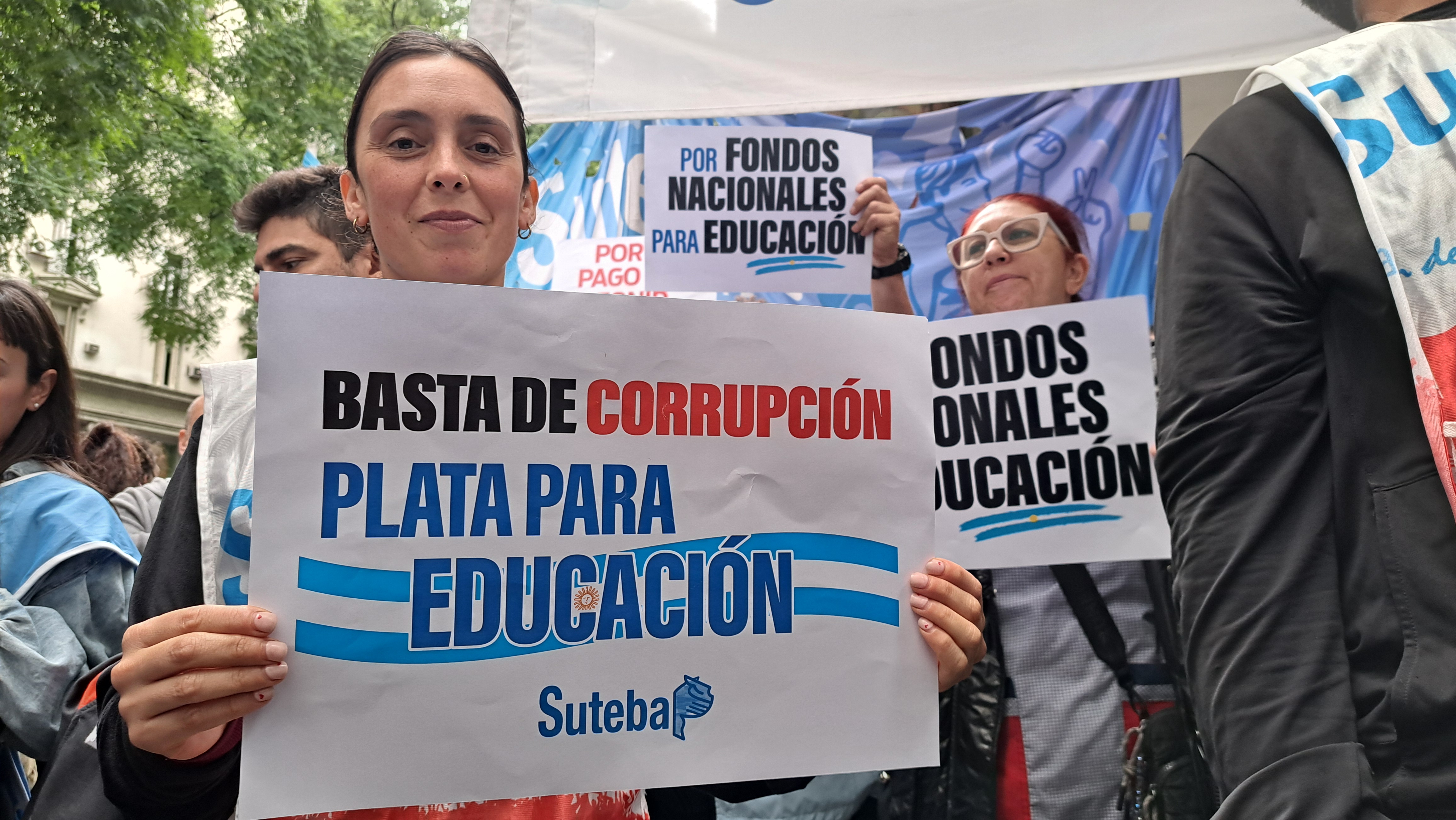 En el marco de la Paritaria Nacional Docente, de la que participó la CTERA, delegaciones del SUTEBA se concentraron desde las 10:30 frente a la Secretaría de Trabajo, en CABA, con carteles que exigían "Basta de corrupción – Plata para Educación" y "Hagan los deberes: paguen la deuda con la Educación a las Provincias".