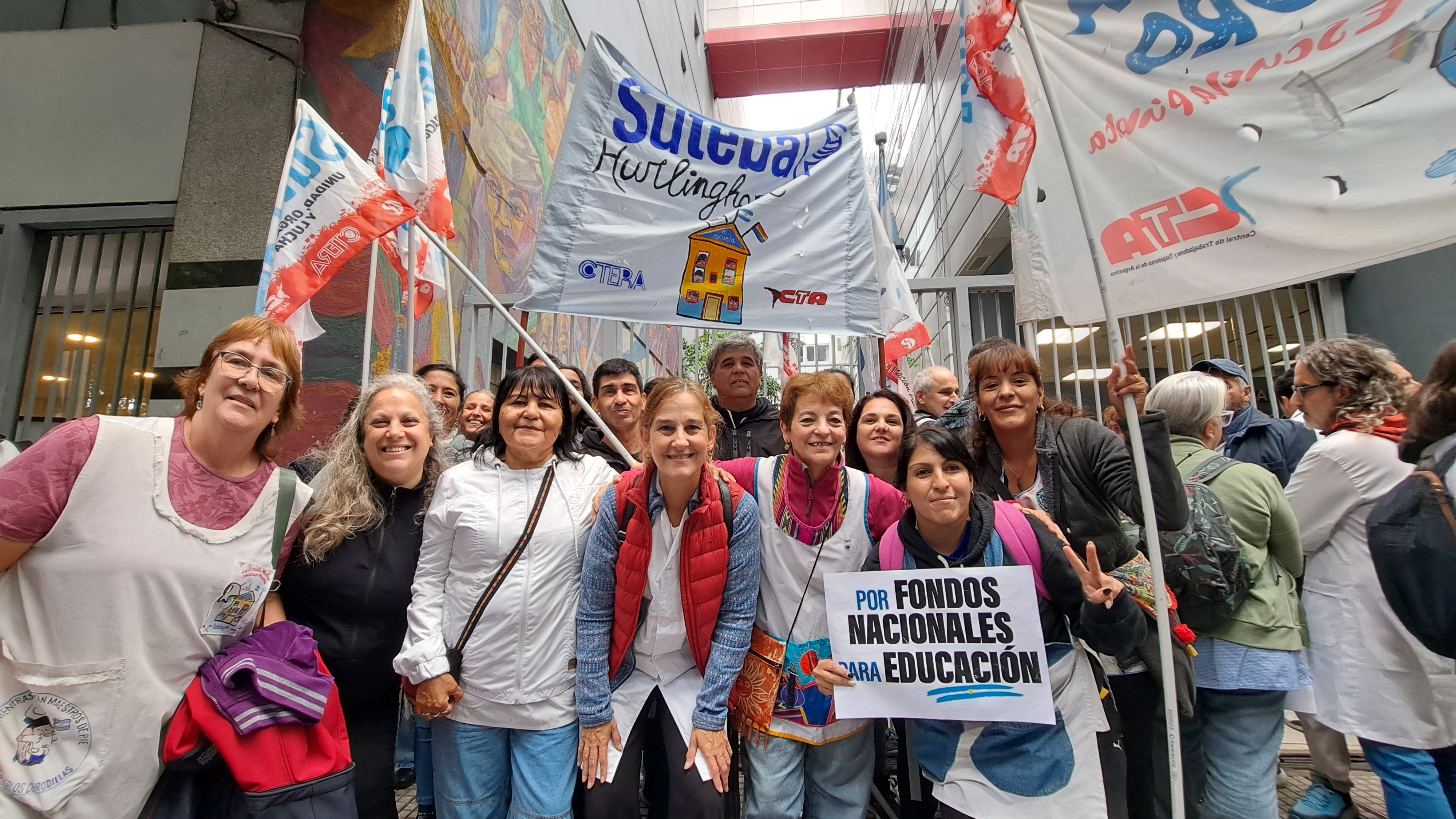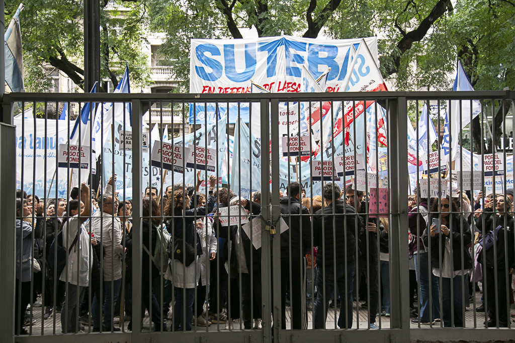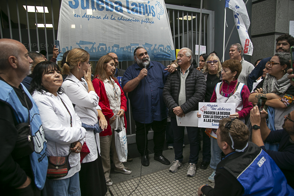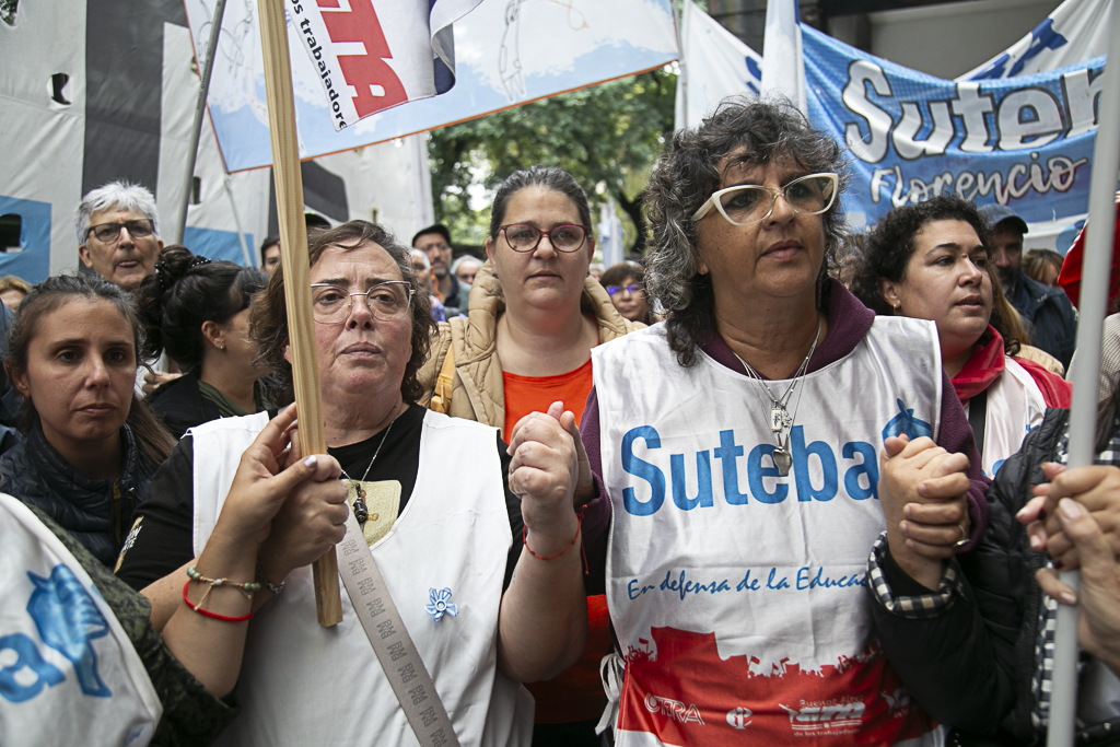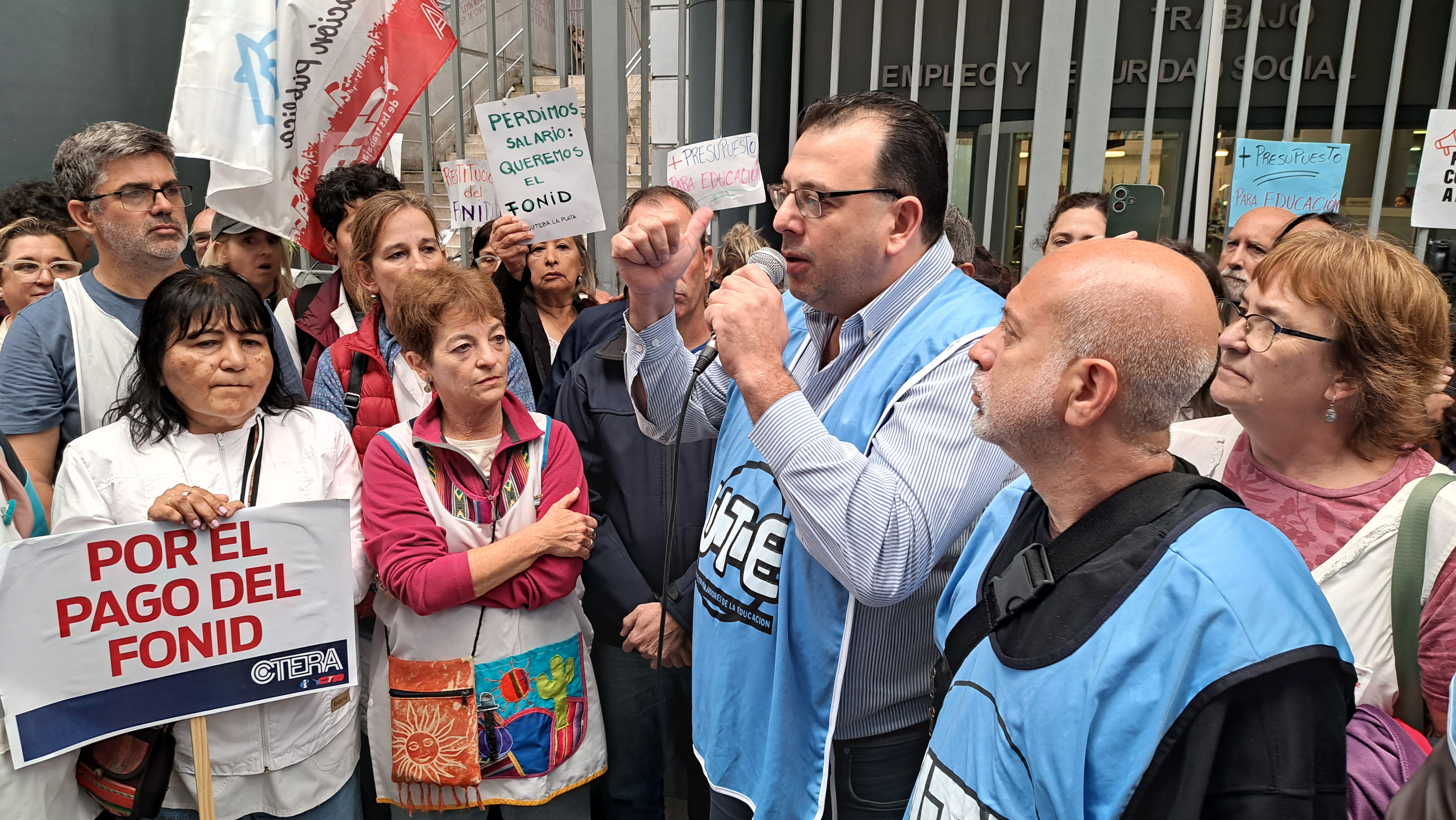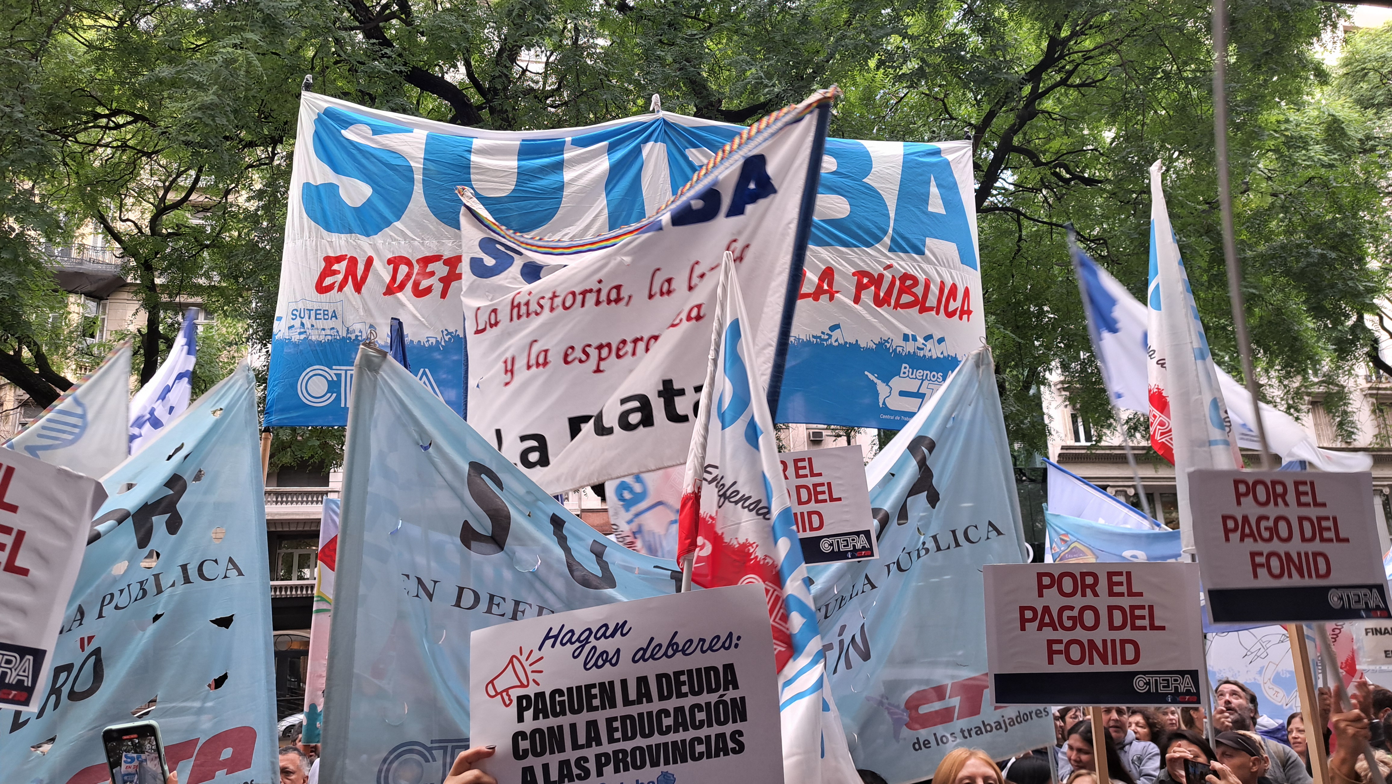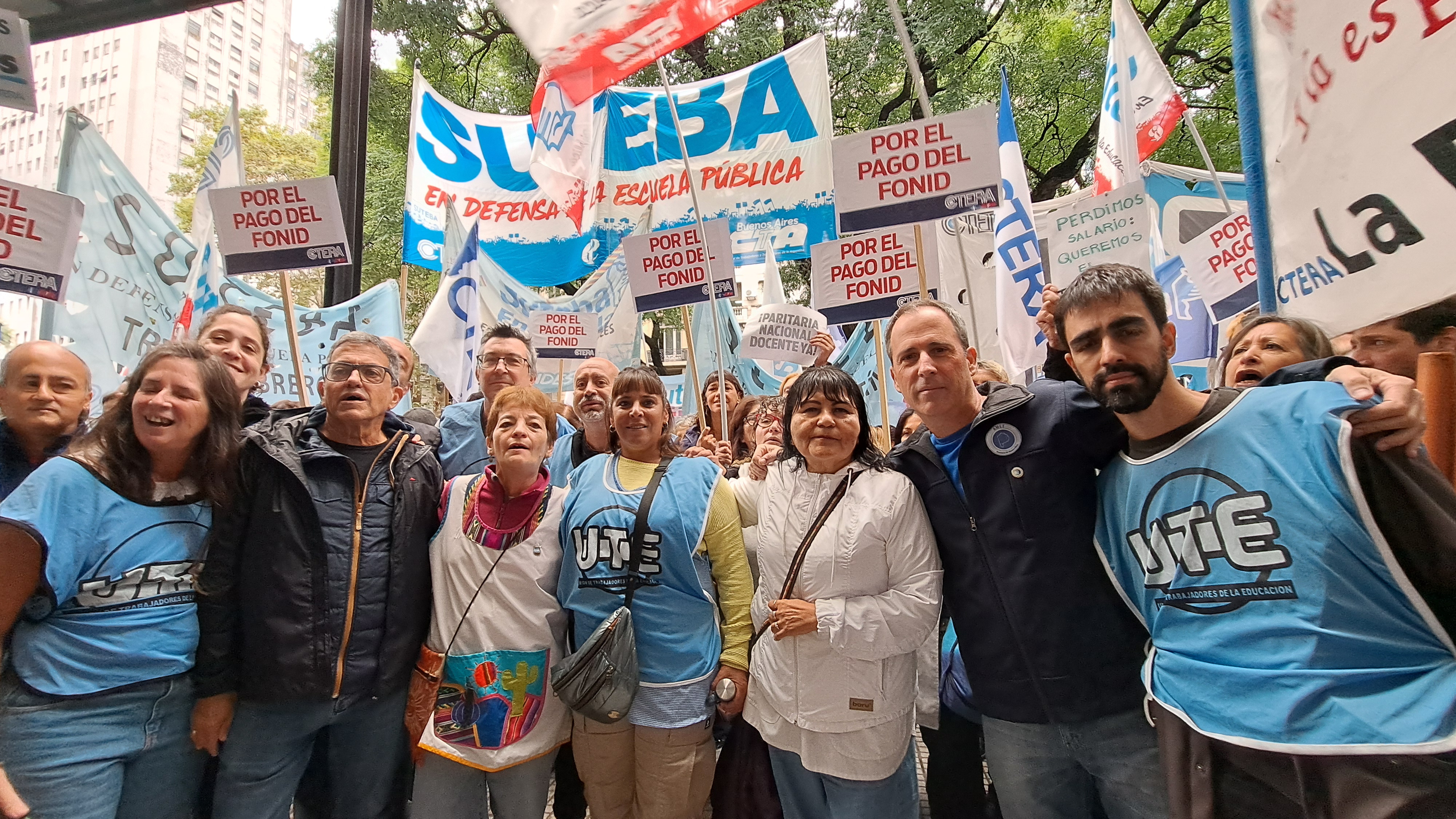 En el marco de la Paritaria Nacional Docente, de la que participó la CTERA, delegaciones del SUTEBA se concentraron desde las 10:30 frente a la Secretaría de Trabajo, en CABA, con carteles que exigían "Basta de corrupción – Plata para Educación" y "Hagan los deberes: paguen la deuda con la Educación a las Provincias".