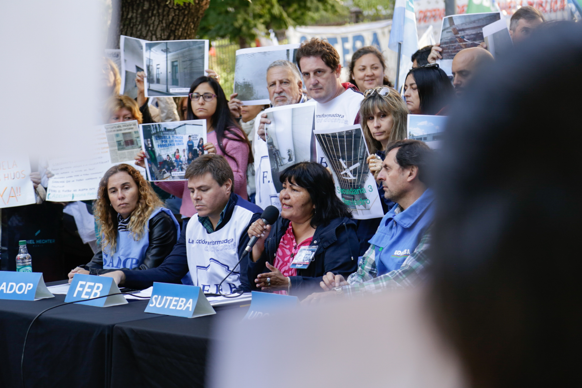 Tomaron la palabra lxs dirigentes de los gremios que componen el FUDB (AMET, FEB, SADOP, SUTEBA y UDOCBA), dirigentes y representantes que dieron a conocer la situación que atraviesan los distritos de Florencio Varela, Quilmes, La Plata, Mercedes, Pilar, Brandsen, Ensenada y General Sarmiento respecto a problemáticas de infraestructura, dando un marco de lo que se vive a nivel general en toda la Provincia.