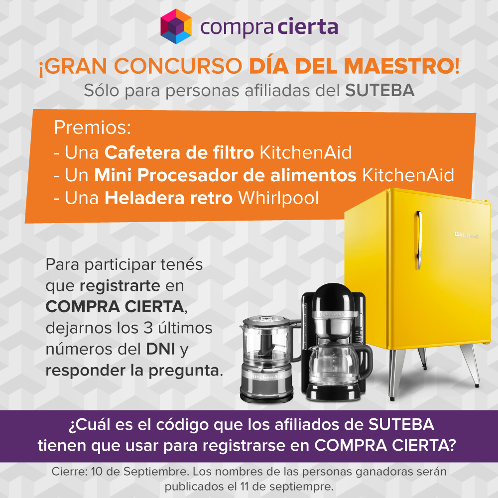 La Secretaría de Promoción Social y Turismo del Sindicato Unificado de Trabajadores de la Educación de Buenos Aires (SUTEBA) junto con Whirlpool Argentina S.R.L (en adelante "El Organizador") invita a las personas que estén afiliadas al Sindicato a participar de este concurso para celebrar el Día del Maestro quienes, por su sola participación, aceptan de pleno derecho todas y cada una de las disposiciones previstas en estas bases y condiciones (las "Bases").