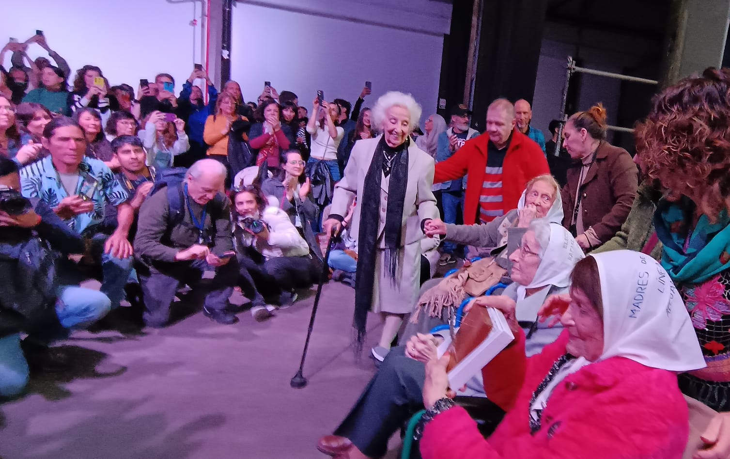 Estela de Carlotto, junto sus incansables compañeras, las Madres Taty Almeida, Carmen Lareu y Clara Weinstein, ingresaron con un emotivo aplauso de lxs presentes a la celebración de este nuevo aniversario de Abuelas y en el cumpleaños 95 de Estela, que contó con la presencia de nietxs restituidxs, representantes de Organismos de Derechos Humanos, de Organizaciones Sindicales, políticas y sociales.