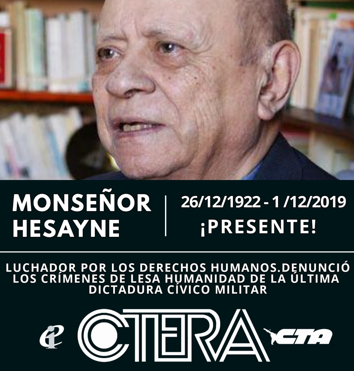El domingo 1º de diciembre y a los 96 años falleció en Azul, su ciudad natal, el Monseñor Miguel Hesayne. El Obispo emérito de Viedma tuvo una participación destacada en la resistencia contra la dictadura cívico militar. Su voz fue una de las pocas de la cúpula eclesiástica que denunció los aberrantes crímenes de lesa humanidad.