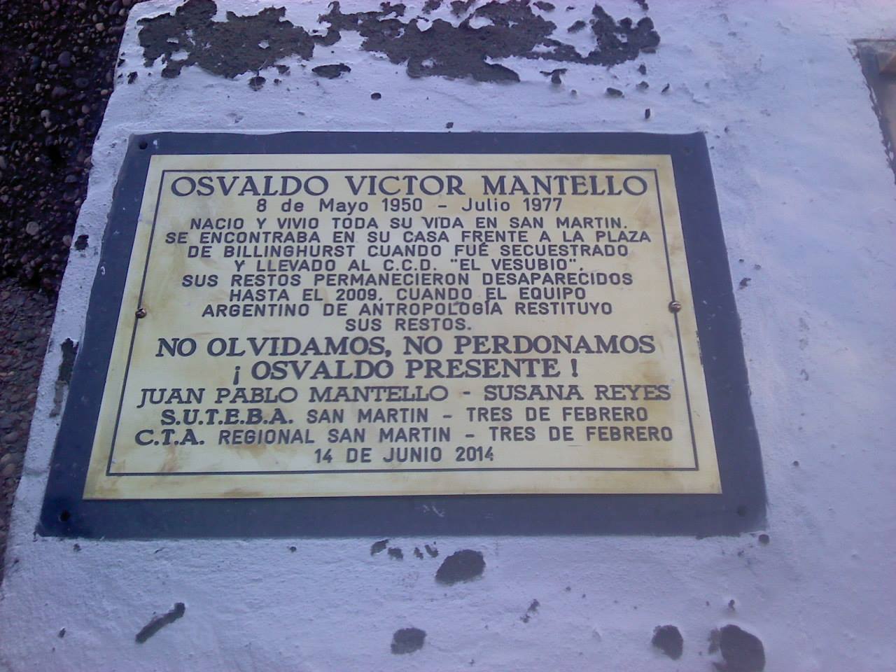 El SUTEBA Seccional y la CTA Regional San Martín y Tres de Febrero realizó, el sábado 14 de junio, un homenaje al compañero Osvaldo Victor Mantello, detenido y desaparecido el 16 de junio de 1977 en Billinghurst Partido de Gral San Martín.