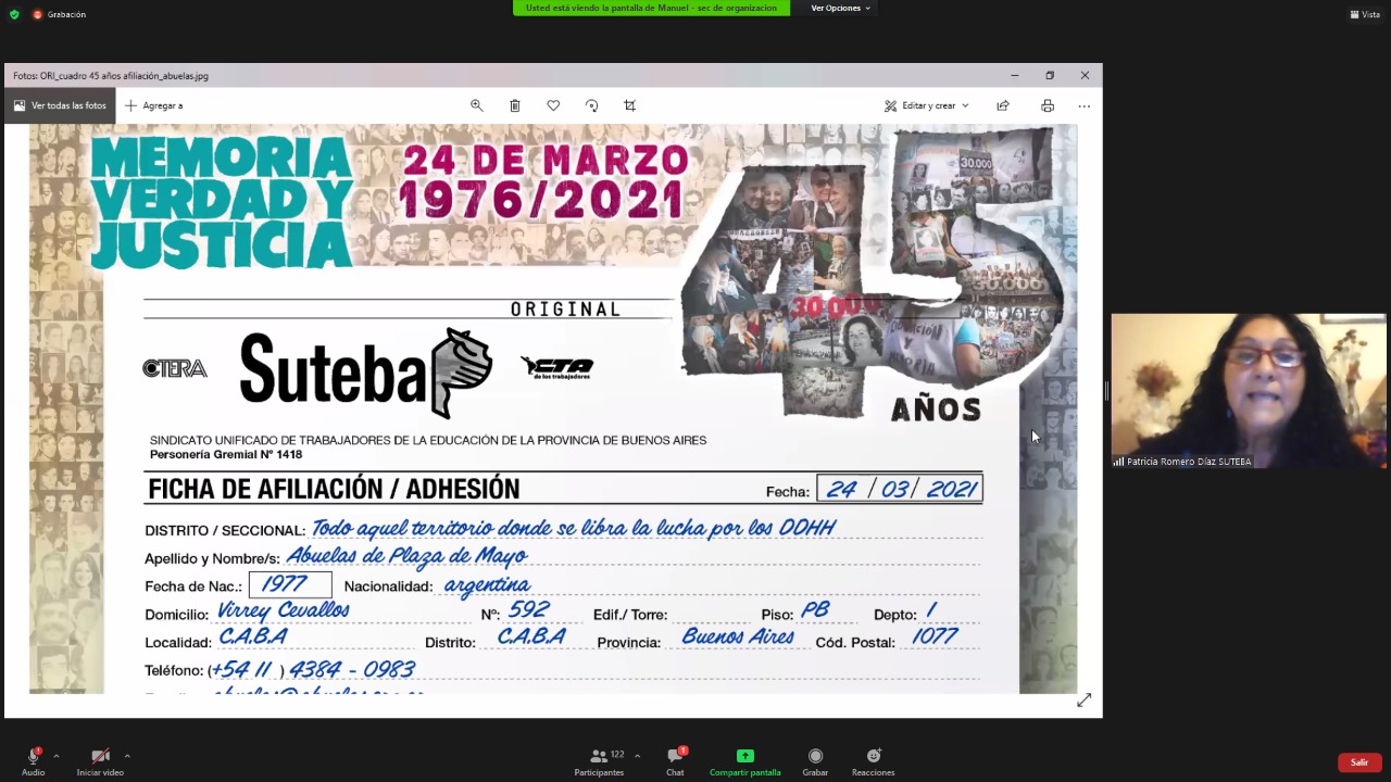 Ayer, jueves 18 de marzo, el SUTEBA brindó un emotivo homenaje a la histórica lucha de Madres y Abuelas de Plaza de Mayo por la Memoria, la Verdad y la Justicia; organizado por la Secretaría de Derechos Humanos, a cargo de Patricia Romero Díaz y Mónica Grandoli. Durante el encuentro se realizó una Afiliación Honorífica a las Abuelas y Madres de Plaza de Mayo, Maestras en la lucha por los Derechos Humanos.