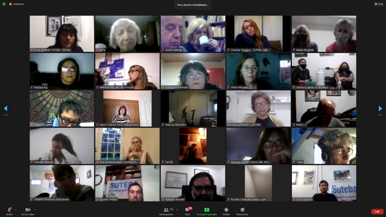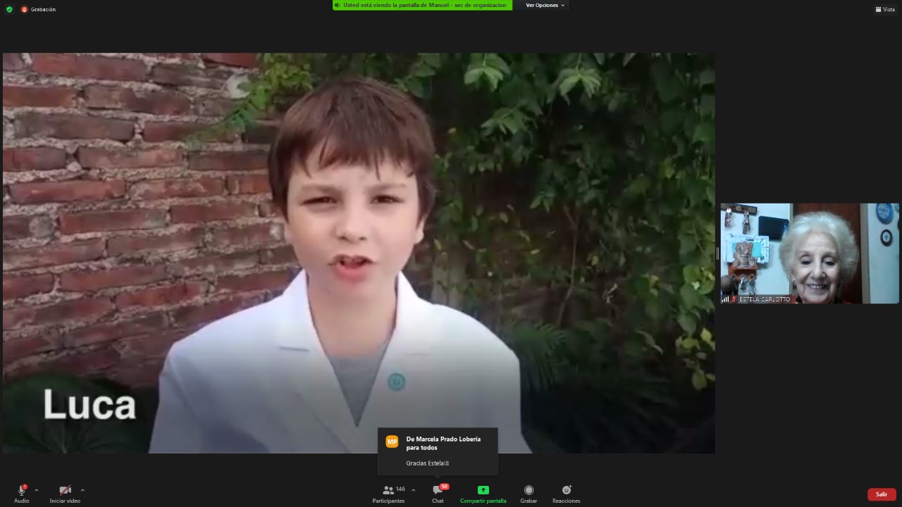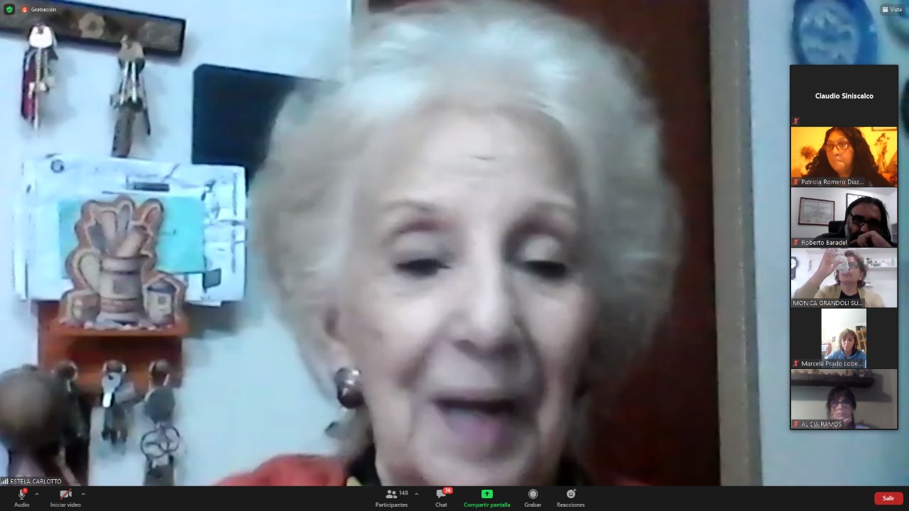 A su turno, Estela de Carlotto señaló: "Todas las mujeres tenemos una leona adentro, cuando nos tocan a un hijo, una hija, sacamos las uñas para luchar, de la mejor manera posible pero con esa rebeldía y ese dolor a la vez. Lxs Docentes no trabajan para ganar, trabajan por vocación, por amor. Yo quiero seguir colaborando como Maestra, cuando podamos estar en libertad de acción y presencia, para seguir visitándolxs, visitando las Escuelas. La juventud y la adolescencia de nuestro país son maravillosas: salen, reclaman, defienden sus derechos. Amor es una palabra clave: resistir, pero sin violencia, y siempre con el corazón abierto".