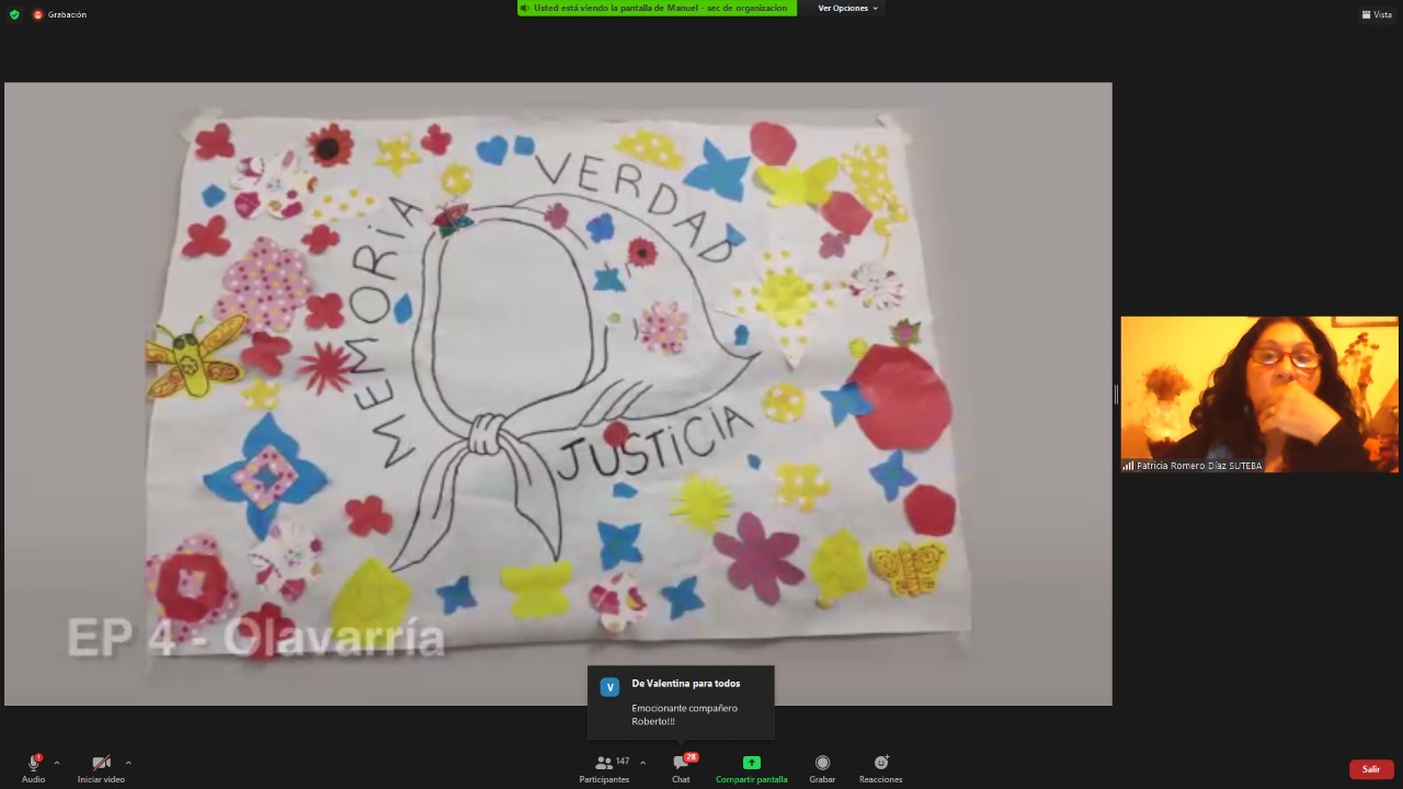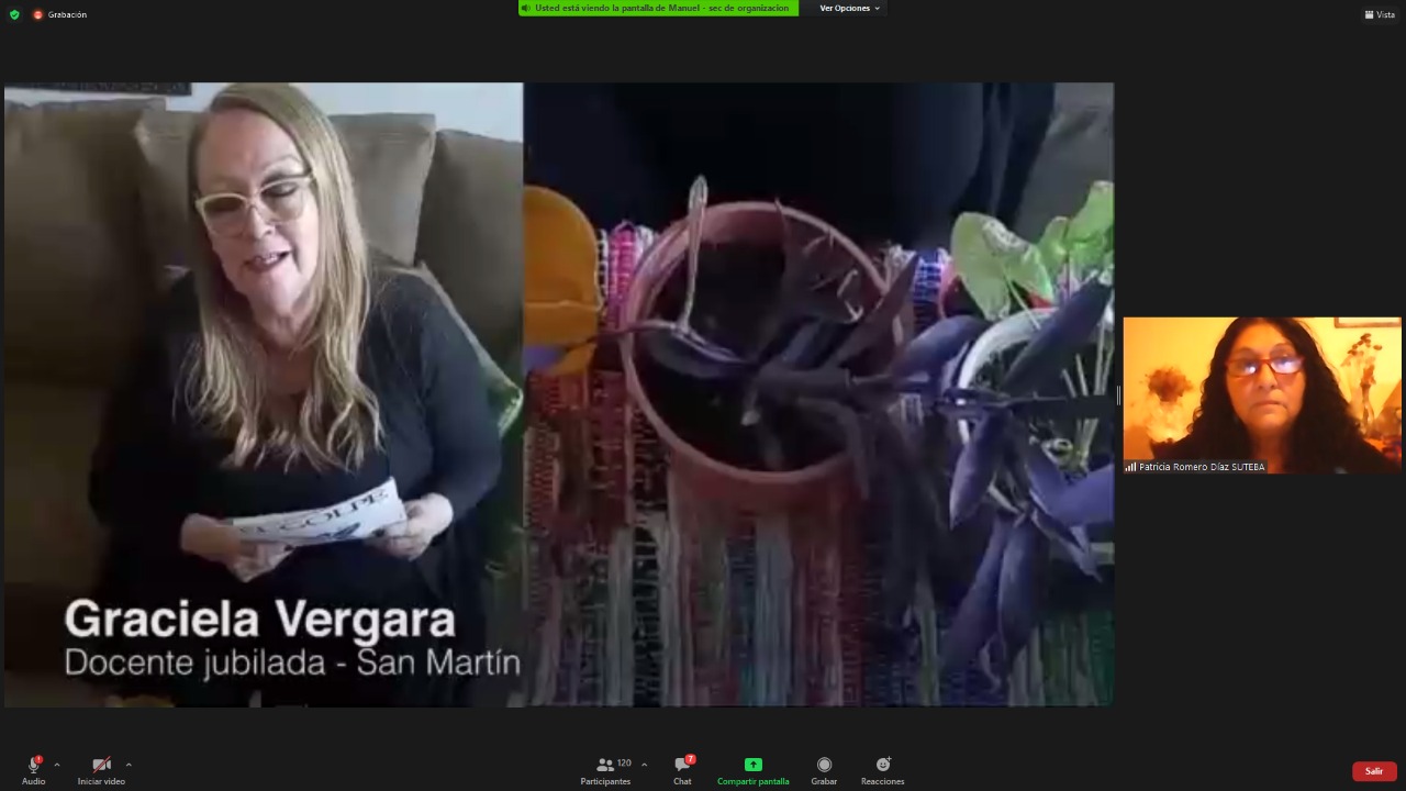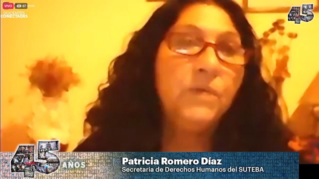 Patricia Romero Díaz, Secretaria de DDHH del SUTEBA, expresó: "Ustedes transformaron el dolor en fuerza, y la bronca y el temor, en lucha organizada. Somos parte del movimiento obrero y tenemos una larga historia de lucha colectiva, pero volvimos a aprender que la construcción debe ser colectiva con el ejemplo de ustedes. En las Escuelas, lxs Maestrxs construimos Memoria. Todo esto lo aprendimos de ustedes, y seguimos aprendiendo cada vez que Estela nos dice que la lucha que libraron las Abuelas en la búsqueda de sus nietxs es impulsada por el amor. El odio, que se lo guarden ellos, los que están del otro lado. No es nuestro territorio. Queridas Madres, ustedes han marcado el camino".