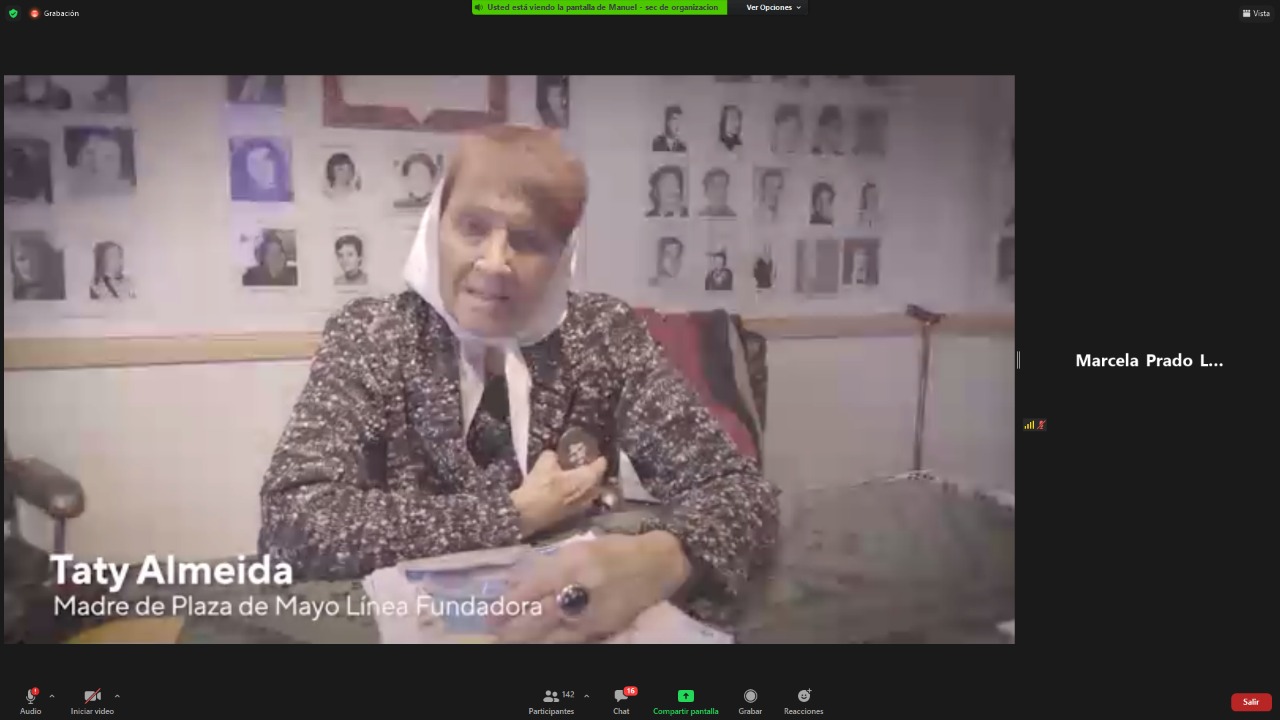 Por su parte, luego de relatar la historia de la desaparición de su hijo Alejandro y su acercamiento a Madres de Plaza de Mayo, Taty Almeida expresó: "Después de tantos años seguimos en la lucha, quedamos muy pocas, pero estamos tranquilas porque están lxs jóvenes, una juventud maravillosa, militante. No le tengan miedo a la palabra MILITANCIA, militancia es compromiso, es compañerismo, ocuparse del otro, como lo hicieron nuestxs hijxs, que eran militantes políticxs. A pesar de los bastones y las sillas de ruedas, las locas seguimos de pie, pero estxs jóvenes son lxs que valen".