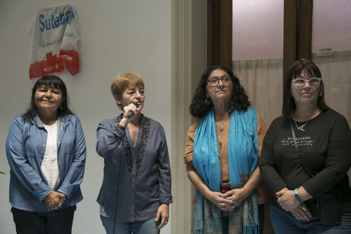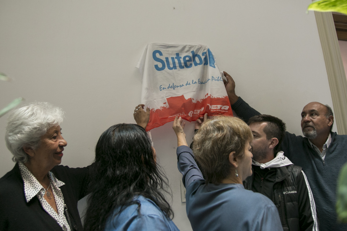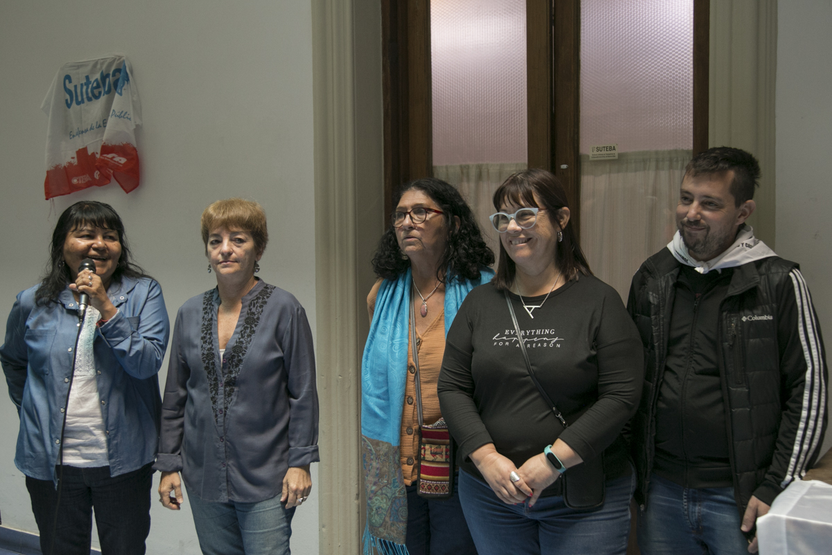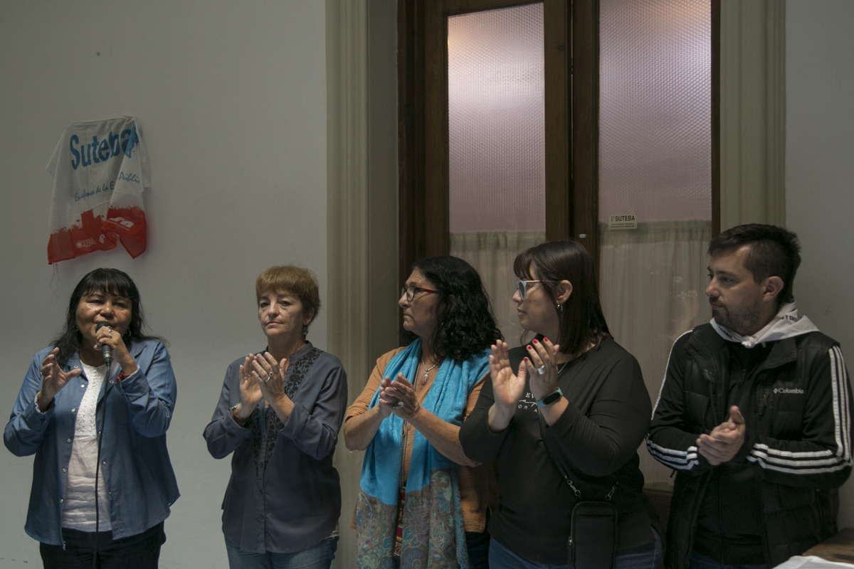 "Hay un registro que venimos haciendo desde el SUTEBA, vinculado también a un trabajo de la CTERA, y tenemos hasta el momento más de 450 Trabajadorxs de la Educación que se comprometieron en aquellos años 70 en la construcción de un mundo más justo y solidario. Esto que vamos a descubrir acá es ese testimonio. Y vamos a incorporarle más adelante los nombres de cada unx de lxs compañerxs Trabajadorxs de la Educación".
