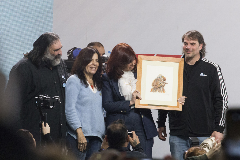 Luego de cantar el Himno Nacional, apenas iniciado el Plenario, se vivió un momento especialmente emotivo. Junto a Roberto Baradel, Secretario General del SUTEBA y de la CTA Provincia, y a Daniel Catalano, Secretario General de ATE Capital, Elisa Semino, Secretaria de Comunicaciones de nuestro Sindicato, subió al escenario para obsequiarle a Cristina un cuadro de su autoría: "Tanto Amor", una obra en acuarela y tinta que retrata un abrazo entre la Vicepresidenta y Néstor Kirchner.