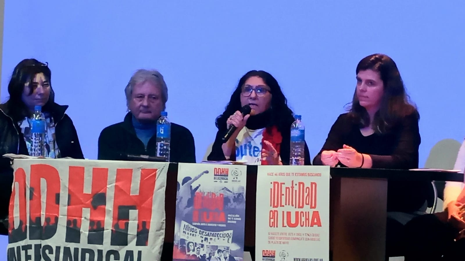"Lxs nietxs están entre nosotrxs. Son madres y padres de nuestrxs Alumnxs, son operarixs en una imprenta, son médicxs en nuestro hospital. Tenemos que tener los ojos abiertos, estar atentxs", sostuvo Patricia Romero Díaz, quien integró el panel junto a Florencia Méndez (APUBA), Carlos Monestes (UTE CTA); Florencia Chiappetta (Foetra), y las nietas restituidas Claudia Poblete y Sabrina Valenzuela Negro.