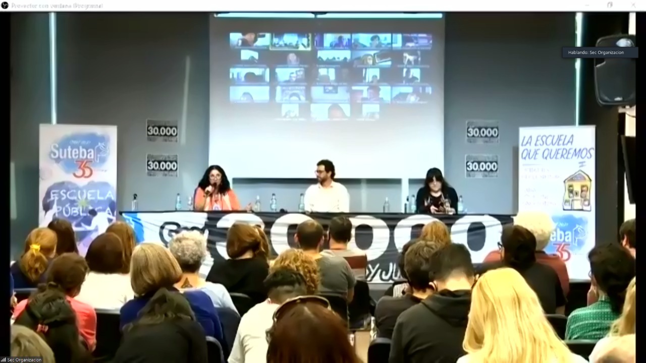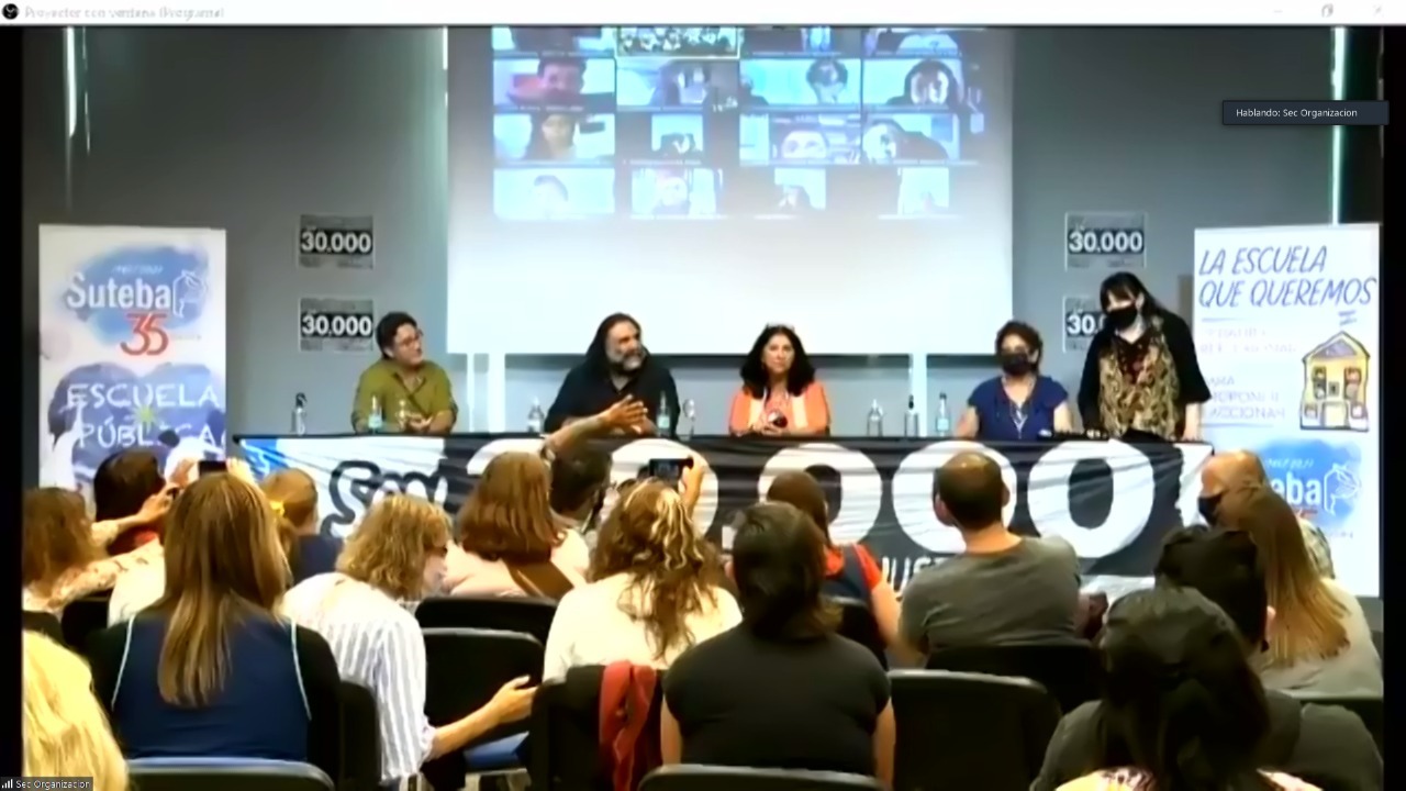 Terminando el encuentro, Roberto Baradel, Secretario General del SUTEBA, repudió la vandalización de un mural de la agrupación HIJOS en memoria de lxs 30 mil desaparecidxs, ubicado en Berisso. "Son expresiones de odio. Escuchamos el discurso de las corporaciones, discursos hegemónicos que hablan de la libertad y que acusan de violencia a lo popular, al pueblo. Pero queda claro que son ellos los que ejercen ese tipo de violencia, no ahora, la ejercieron durante la historia de la humanidad. Y esto tiene que ver con lo que pasó en la Argentina con la dictadura cívico militar". Finalmente, destacó que el SUTEBA estuvo, está y seguirá estando donde tiene que estar, "al lado de lxs trabajadorxs, al lado de nuestro pueblo, construyendo unidad y condiciones dignas de vida para todxs".
