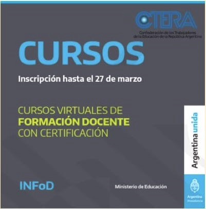 A través de este convenio firmado entre la CTERA y el Ministerio de Educación de la Nación, lxs Docentes afiliadxs de todo el país tienen la chance de inscribirse en los cursos virtuales del INFoD hasta el 27/03 en el siguiente link: https://infod.educacion.gob.ar/cursos
