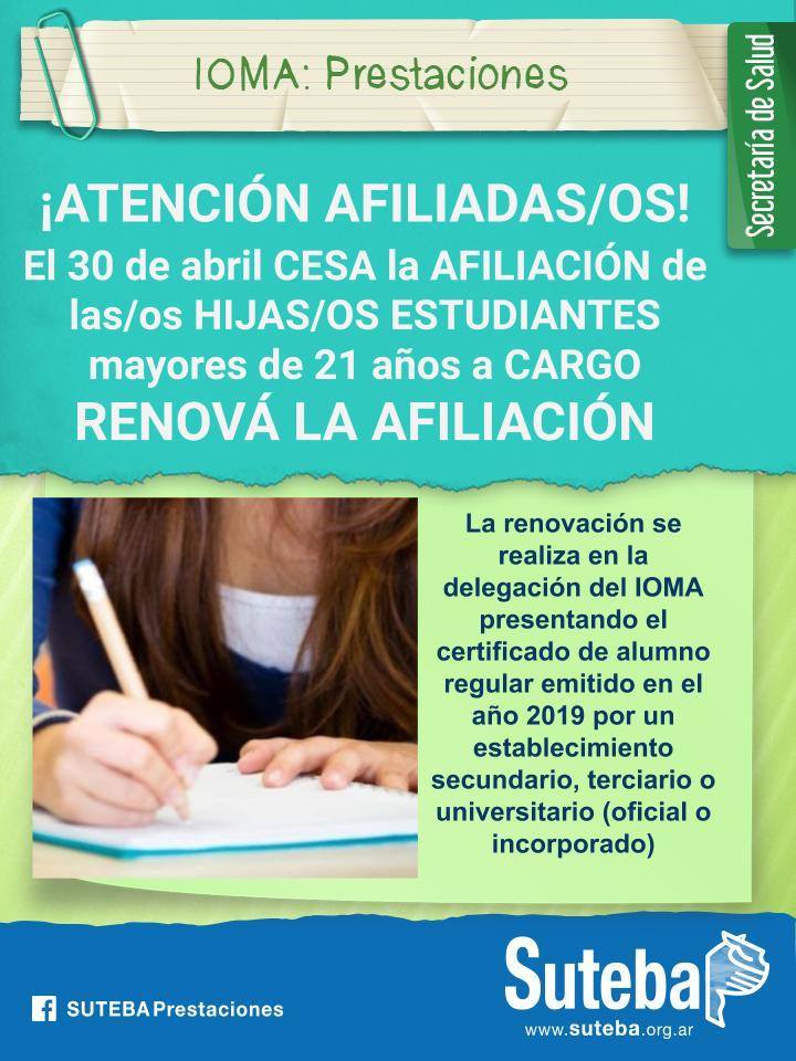 Se debe presentar el certificado de alumna/o regular actualizado cada año en los meses de marzo y abril para renovar la afiliación. Esta condición se mantiene hasta cumplir los 27 años. Es necesario también en estos casos renovar la condición de a cargo en SUTEBA acreditando la renovación de la Obra Social.