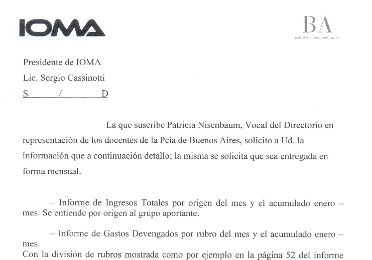 Patricia Nisenbaum, en representación de todos los Trabajadores de la Educación, el día 13 de enero presentó un pedido de informe económico - financiero al nuevo titular de la Obra Social Lic. Sergio Daniel Cassinotti.