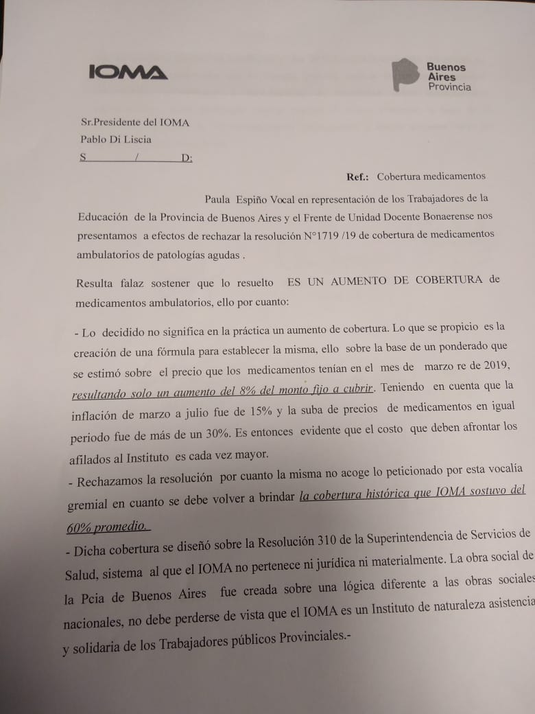 El Frente de Unidad Docente Bonaerense y la Vocal representante de lxs Trabajadorxs de la Educación en el IOMA, Paula Espiño, se reunieron hoy en La Plata y realizaron una presentación conjunta mediante la cual se oponen a la Resolución 1719/19 de cobertura de medicamentos ambulatorios de patologías agudas del IOMA, ya que resulta insuficiente.