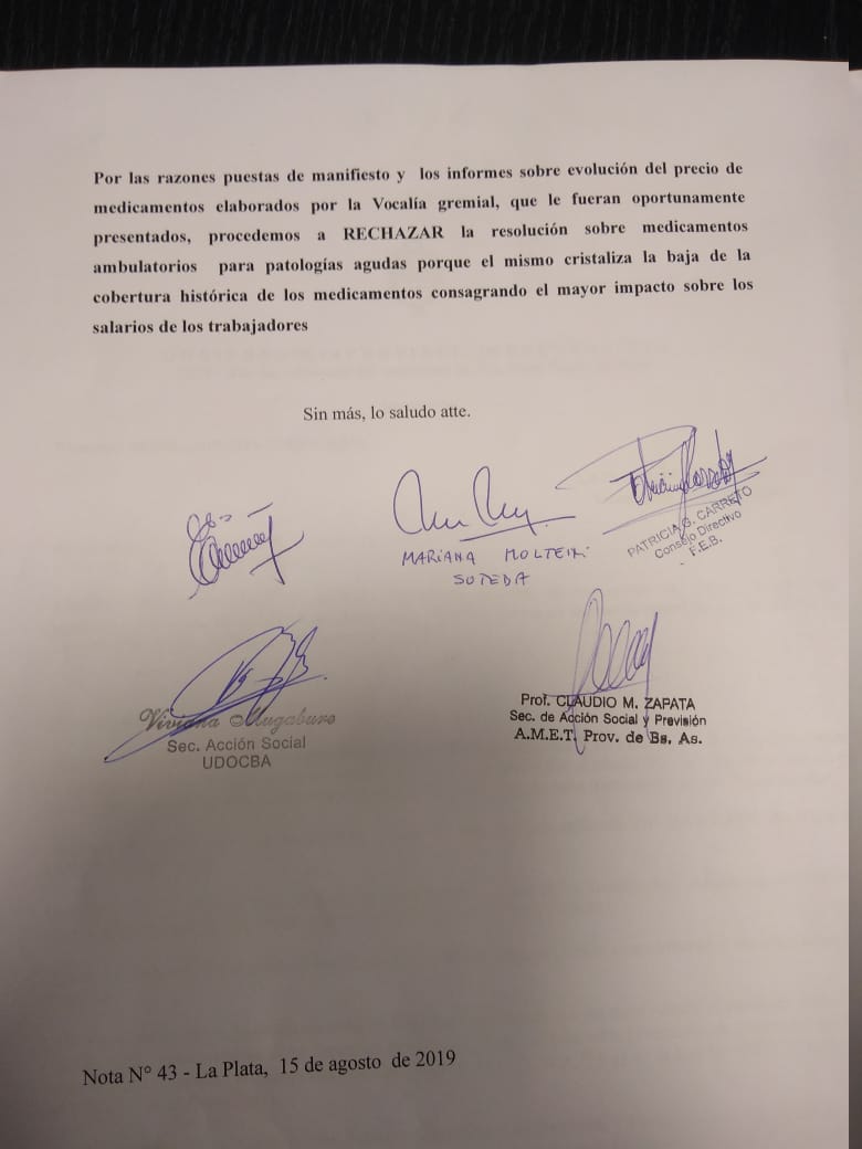 Ante lo expuesto, tanto el FUDB como la Vocalía rechazan la Resolución 1719/19 y exigen nuevamente una Obra Social al servicio de lxs Trabajadorxs, que cumpla con la cobertura histórica de los medicamentos.