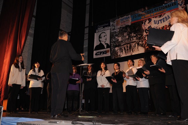 Luego, el Coro Docente de Merlo, dirigido por Poli Barrios, entonó el Himno Nacional y “Crece desde el Pie”, este último, en alusión al crecimiento que ha tenido en estos años el SUTEBA.