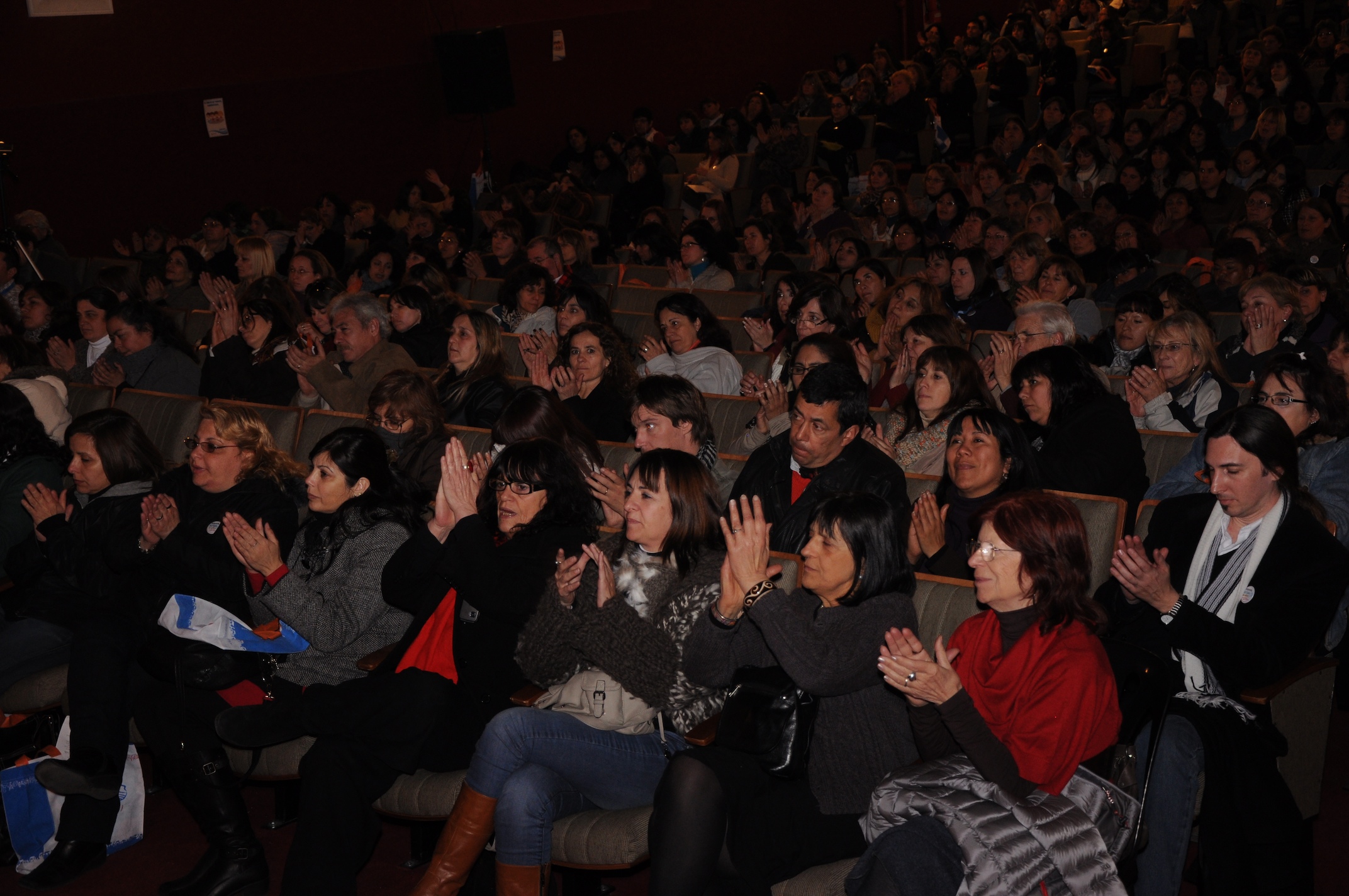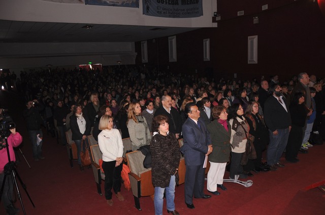 Mientras iban llegando los docentes y se iban acreditando, en el escenario se pasaban videos de chicos y docentes de Merlo por el proyecto “Jóvenes y memoria”.