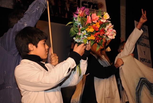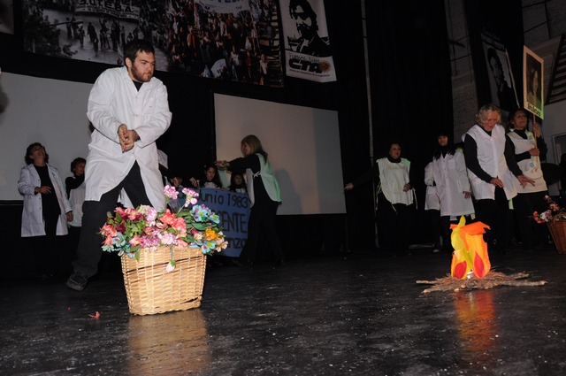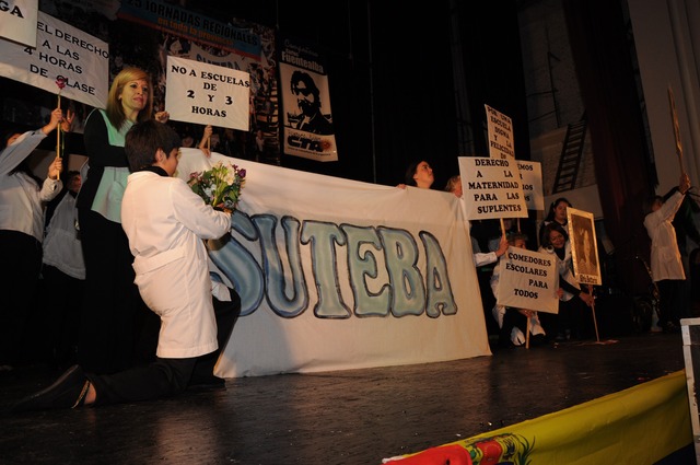 Minutos después comenzó la obra de teatro, donde se buscó mostrar cómo se llegó a la fundación del sindicato. El elenco estaba formado por docentes, jubilados y alumnos de toda la región. Se armaron tres bloques para representar artísticamente la cronología fundacional del SUTEBA. En el primero se vio como los docentes se asumieron como trabajadores de la educación y formaron la CTERA. El segundo bloque trató sobre la época de la dictadura y la resistencia. Y el último, giró en torno al rearmado, la vuelta, la continuación y la finalización con la vuelta de la democracia el 1º de julio de 1983.