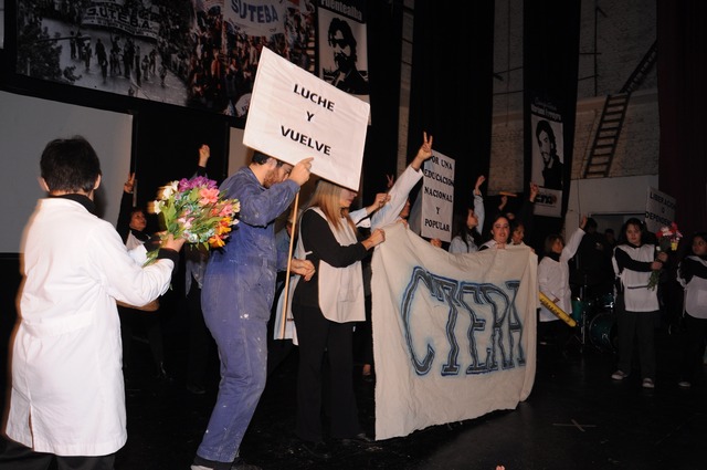 Minutos después comenzó la obra de teatro, donde se buscó mostrar cómo se llegó a la fundación del sindicato. El elenco estaba formado por docentes, jubilados y alumnos de toda la región. Se armaron tres bloques para representar artísticamente la cronología fundacional del SUTEBA. En el primero se vio como los docentes se asumieron como trabajadores de la educación y formaron la CTERA. El segundo bloque trató sobre la época de la dictadura y la resistencia. Y el último, giró en torno al rearmado, la vuelta, la continuación y la finalización con la vuelta de la democracia el 1º de julio de 1983.
