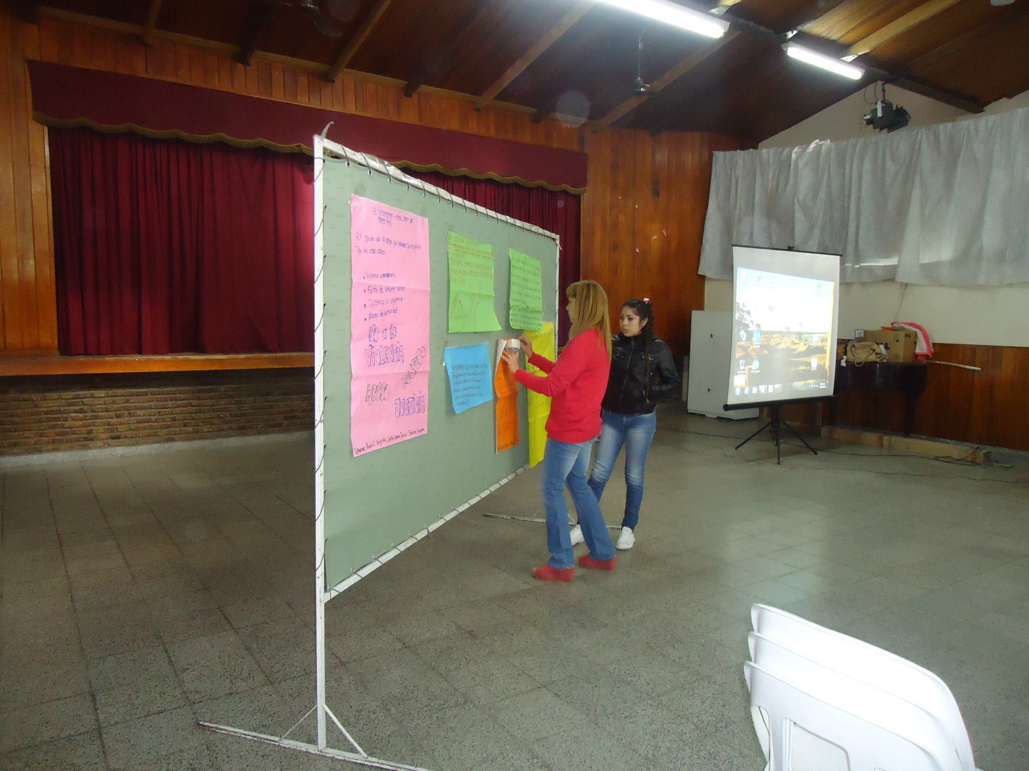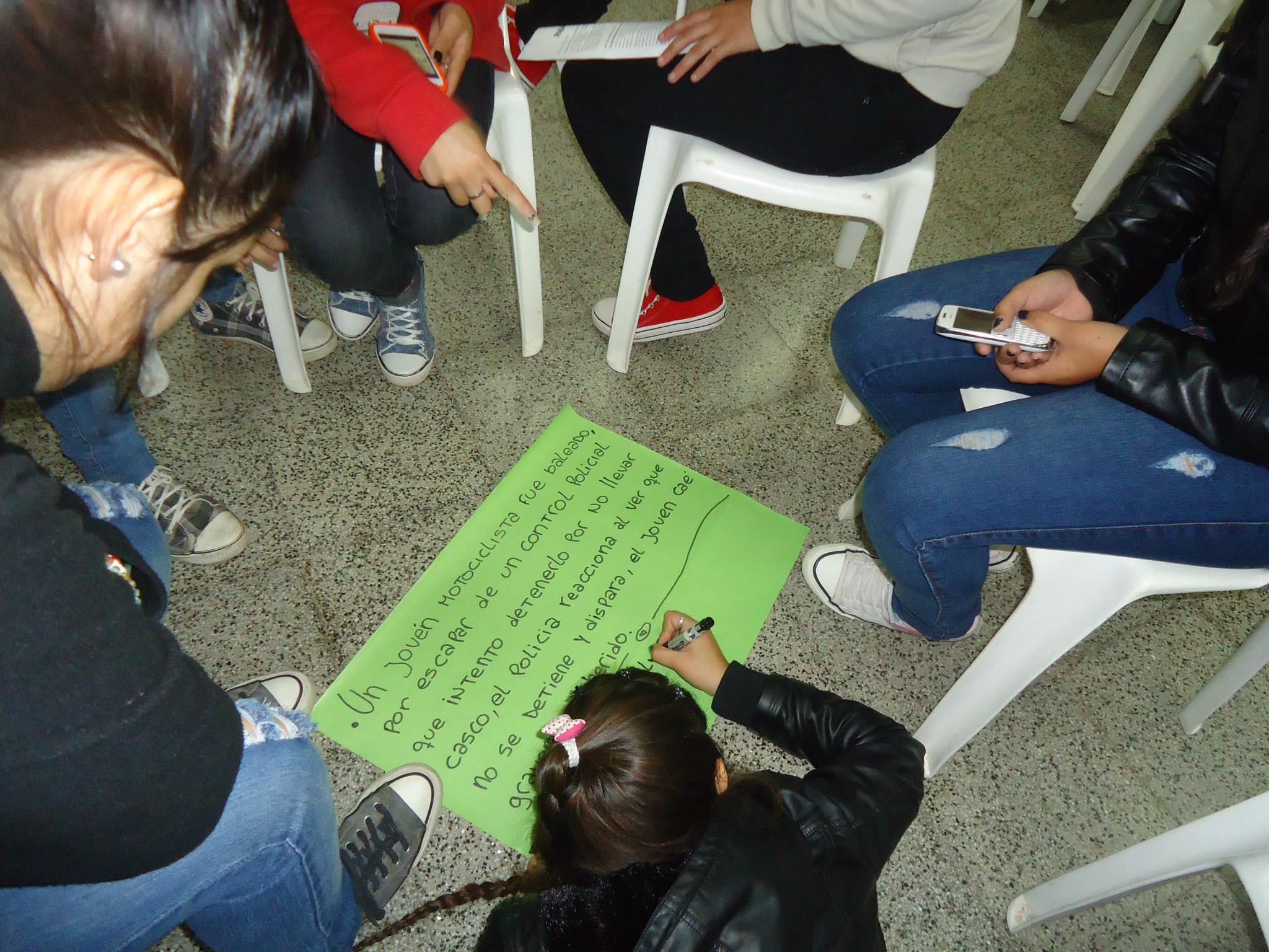 Con los materiales de trabajo, se conformaron grupos para dar lectura a los textos periodísticos de las orientaciones y se vieron videos sobre la temática del día. Además, se repartieron afiches para que los chicos expresaran allí sus pensamientos y luego colocaron dichos afiches en un panel móvil, donde los integrantes del grupo explicaron y debatieron qué se había plasmado allí. Finalmente, este panel quedó expuesto en la entrada de la escuela como cartelera.